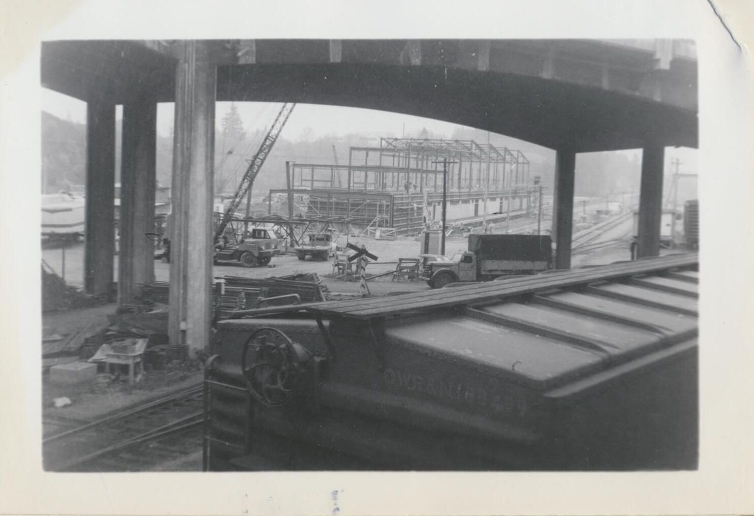 Print, photographic. 5 x 3 1/2 b&w. Construction of can line and warehouse on east side of main brewery and Carlyon Bridge. View of construction looking under Carlyon Bridge. November 2, 1954.