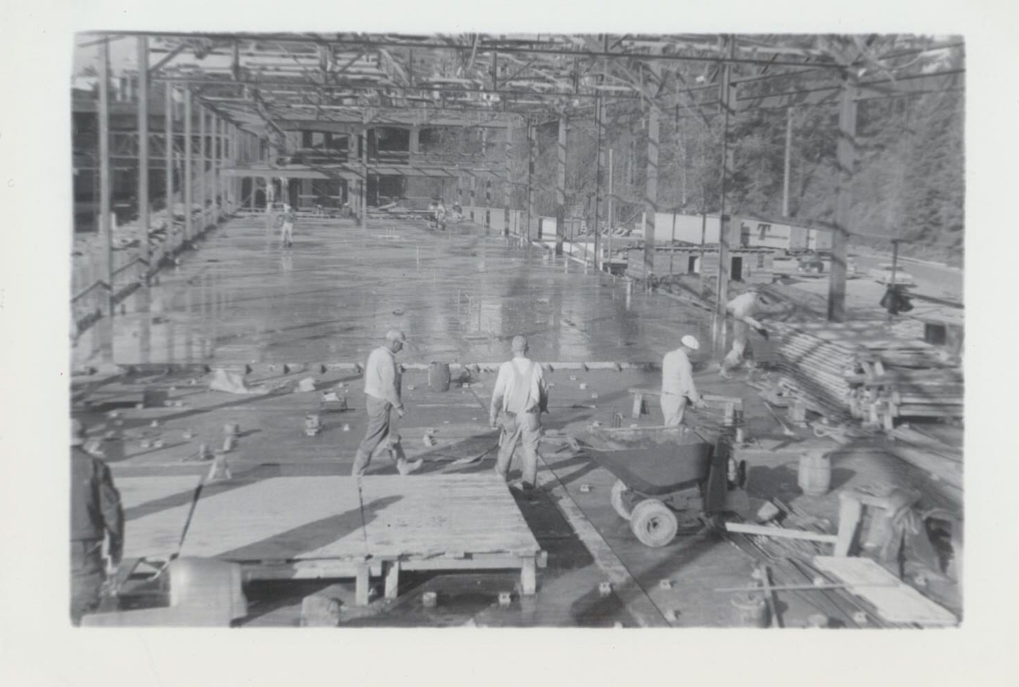 Print, photographic. 5 x 3 1/2 b&w. Construction of can line and warehouse on east side of main brewery and Carlyon Bridge. Concrete work. November 18, 1954.