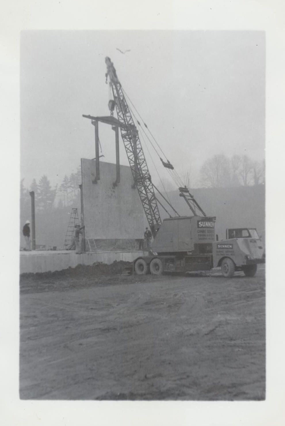 Print, photographic. 5 x 3 1/2 b&w. Construction of can line and warehouse on east side of main brewery and Carlyon Bridge. Lifting a concrete wall panel into place. December 3, 1954.