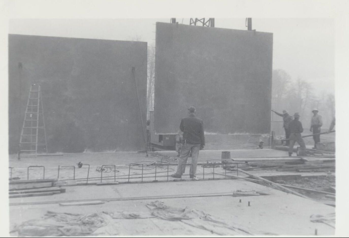 Print, photographic. 5 x 3 1/2 b&w. Construction of can line and warehouse on east side of main brewery and Carlyon Bridge. Lifting a concrete wall panel into place. December 3, 1954.