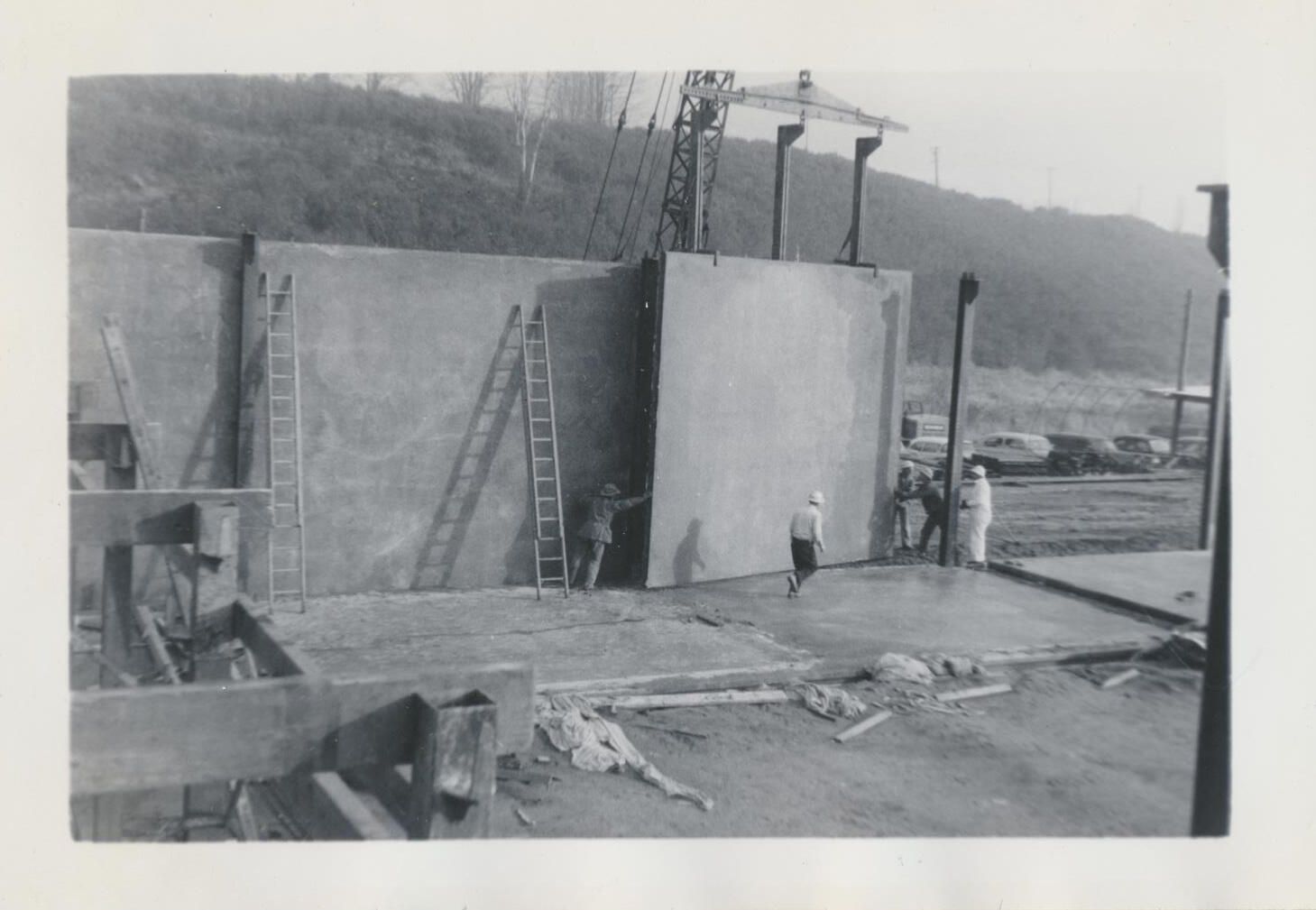 Print, photographic. 5 x 3 1/2 b&w. Construction of can line and warehouse on east side of main brewery and Carlyon Bridge. Lifting a concrete wall panel into place. December 7, 1954.