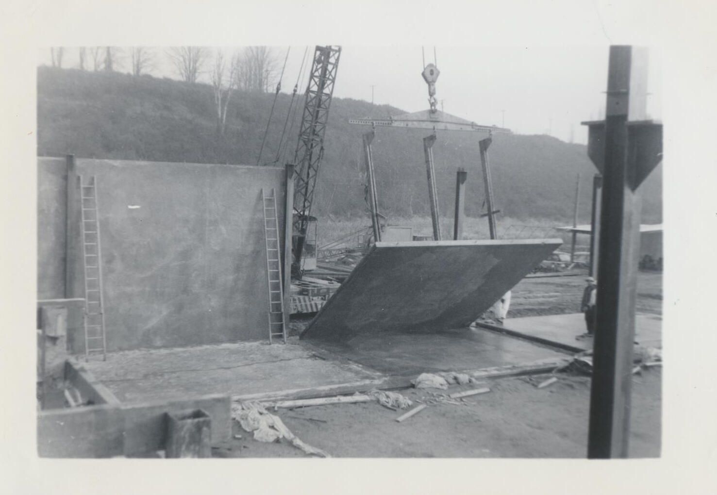 Print, photographic. 5 x 3 1/2 b&w. Construction of can line and warehouse on east side of main brewery and Carlyon Bridge. Lifting a concrete wall panel into place. December 7, 1954.