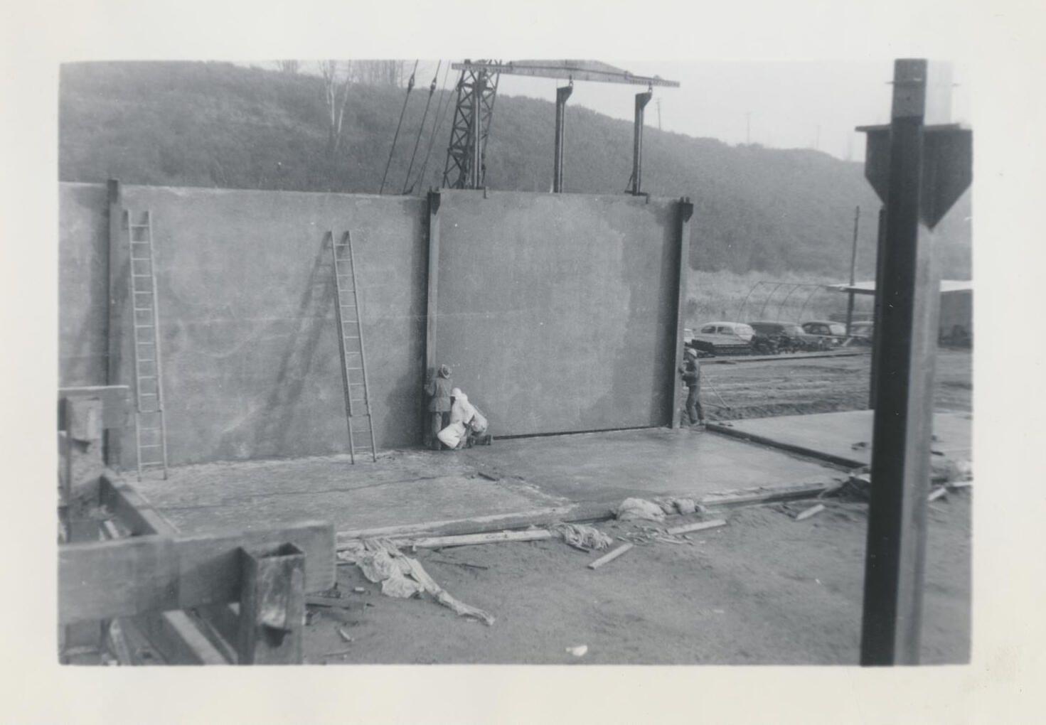 Print, photographic. 5 x 3 1/2 b&w. Construction of can line and warehouse on east side of main brewery and Carlyon Bridge. Lifting a concrete wall panel into place. December 7, 1954.