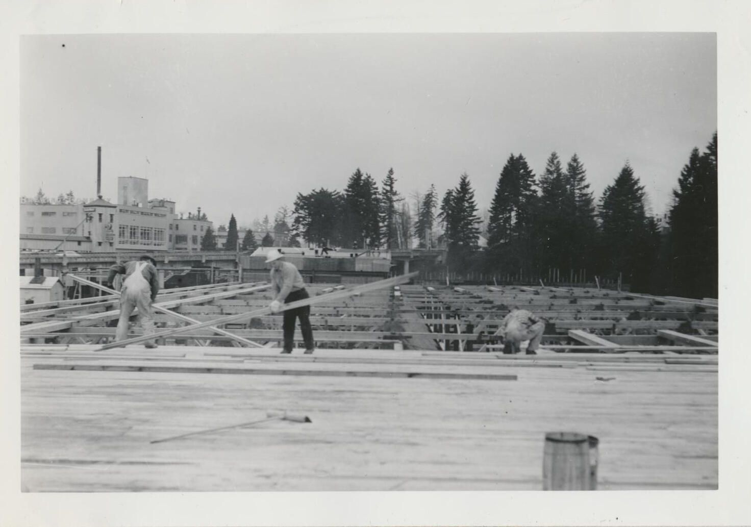 Print, photographic. 5 x 3 1/2 b&w. Construction of can line and warehouse on east side of main brewery and Carlyon Bridge. Men at work. January 10, 1955