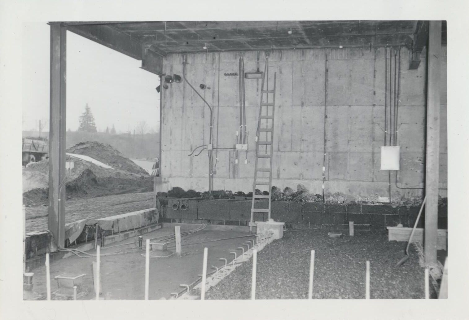 Print, photographic. 5 x 3 1/2 b&w. Construction of can line and warehouse on east side of main brewery and Carlyon Bridge. Bottleshop cellar. January 10, 1955