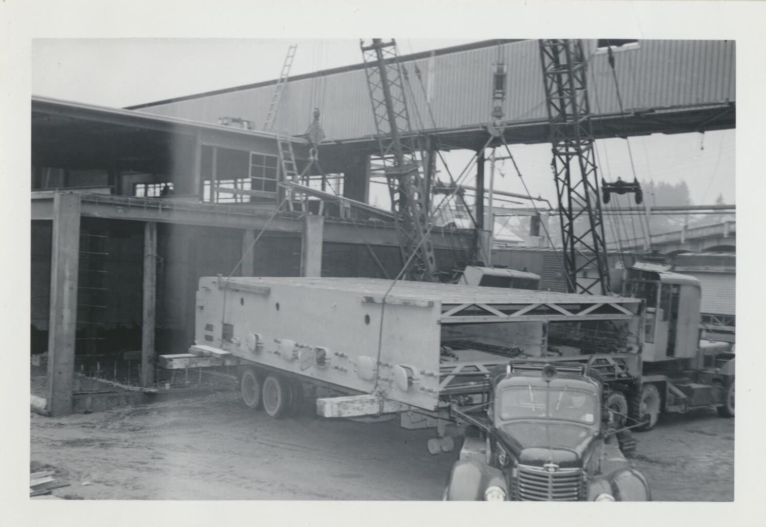 Print, photographic. 5 x 3 1/2 b&w. Construction of can line and warehouse on east side of main brewery and Carlyon Bridge. Pasteurizer for new building. January 11, 1955
