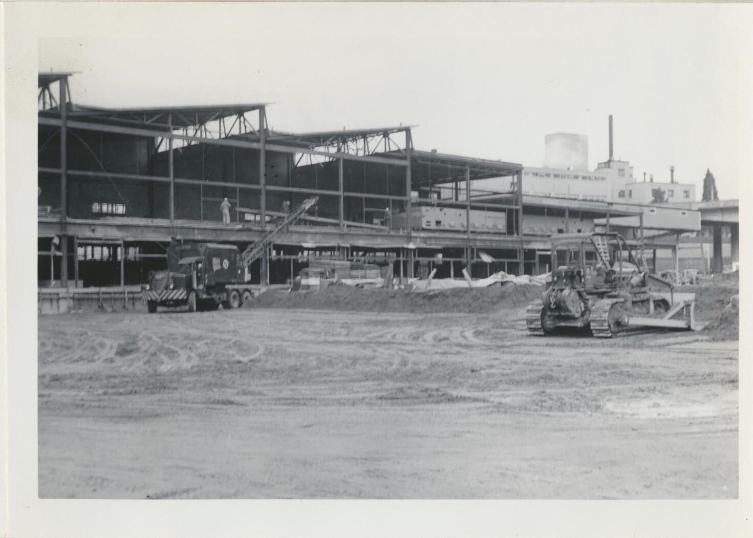 Print, photographic. 5 x 3 1/2 b&w. Construction of can line and warehouse on east side of main brewery and Carlyon Bridge. Overview. January 11, 1955