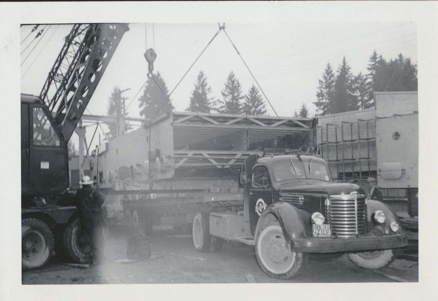 Print, photographic. 5 x 3 1/2 b&w. Construction of can line and warehouse on east side of main brewery and Carlyon Bridge. Pasteurizer for new building. January 11, 1955