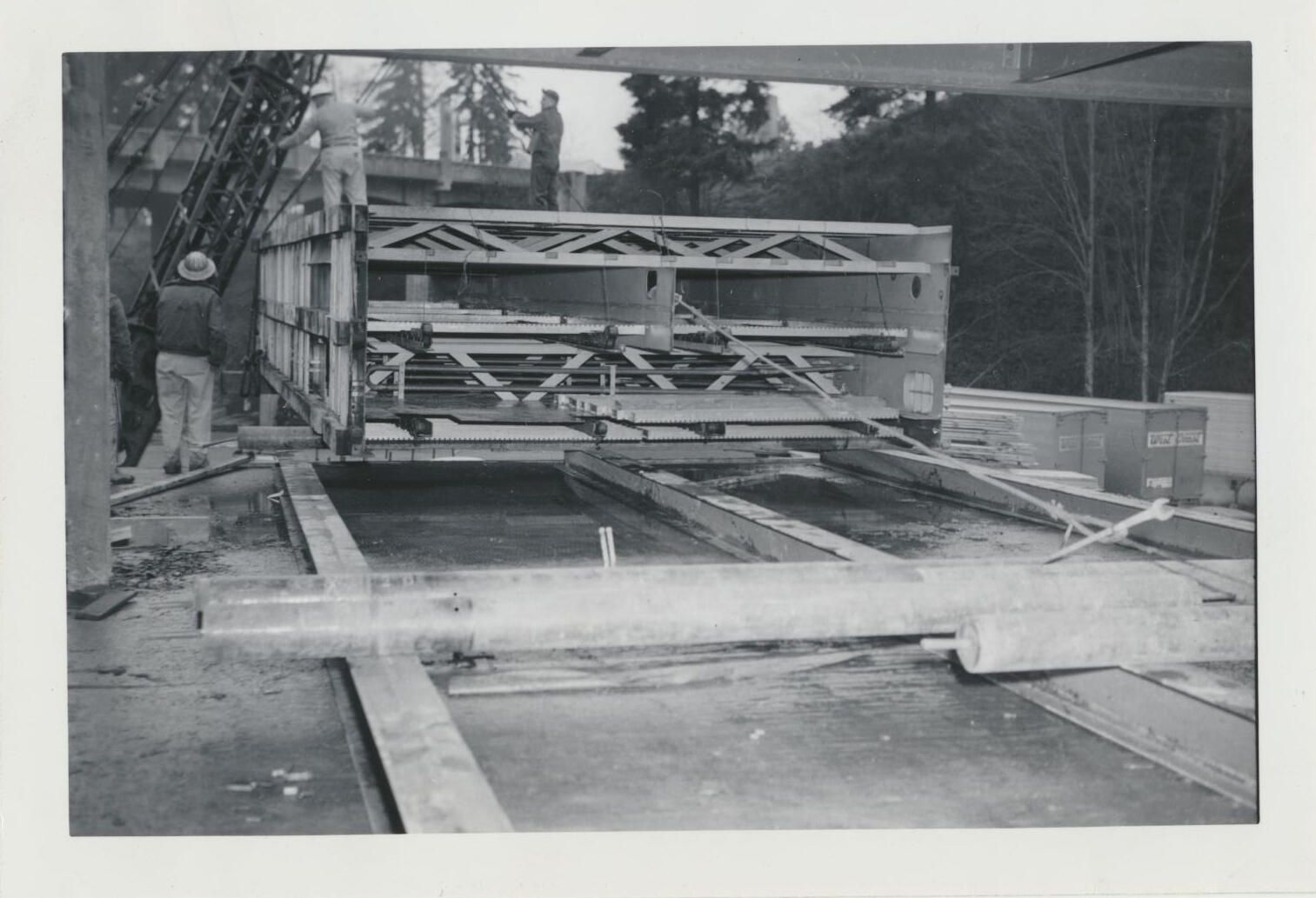 Print, photographic. 5 x 3 1/2 b&w. Construction of can line and warehouse on east side of main brewery and Carlyon Bridge. Pasteurizer for new building. January 11, 1955
