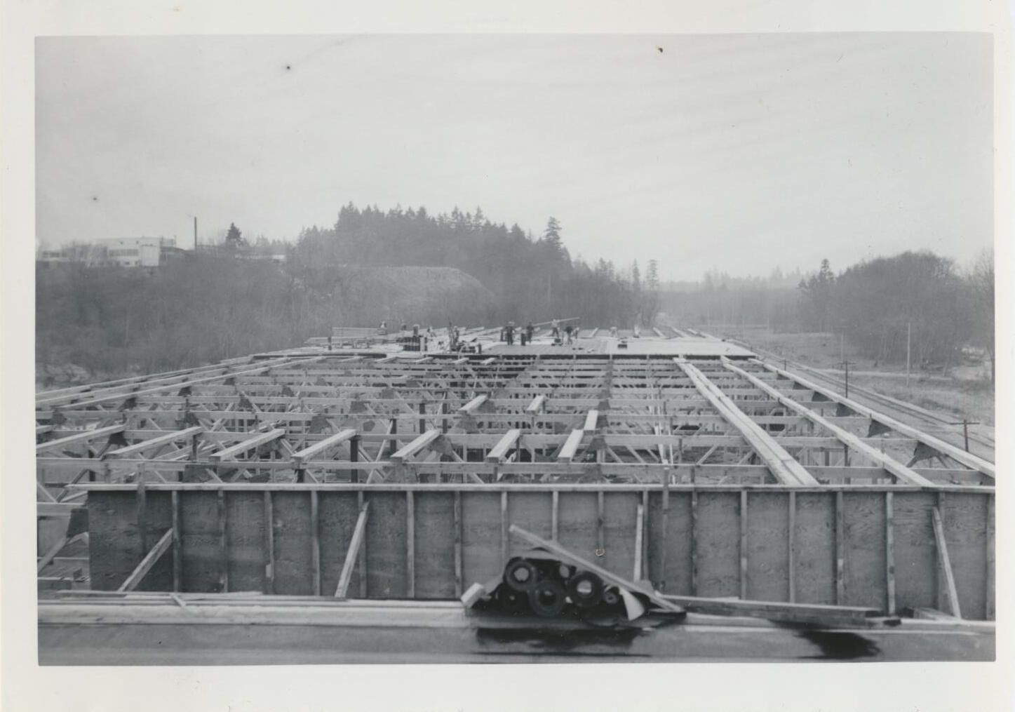 Print, photographic. 5 x 3 1/2 b&w. Construction of can line and warehouse on east side of main brewery and Carlyon Bridge. Chambers Packing in left background. Overview of new building. January 11, 1955Name/Title