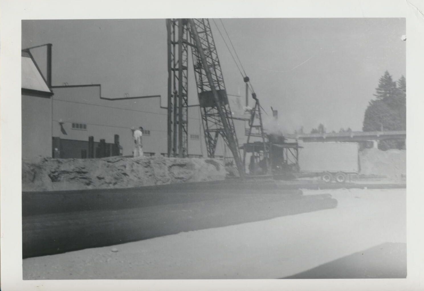 Print, photographic. 5 x 3 1/2 b&w. Construction of can line and warehouse on east side of main brewery and Carlyon Bridge. Bottleshop creosoted piling in foreground. August 20, 1956.