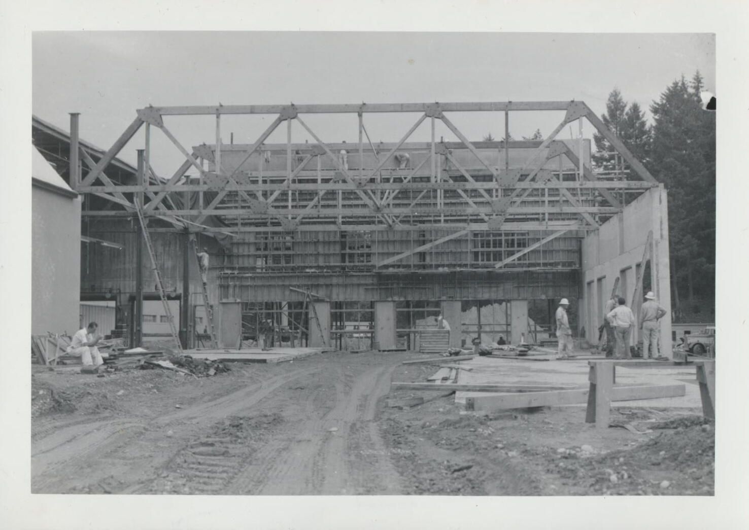 Print, photographic. 5 x 3 1/2 b&w. Construction of can line and warehouse on east side of main brewery and Carlyon Bridge. Warehouse addition trusses. October 5, 1956.