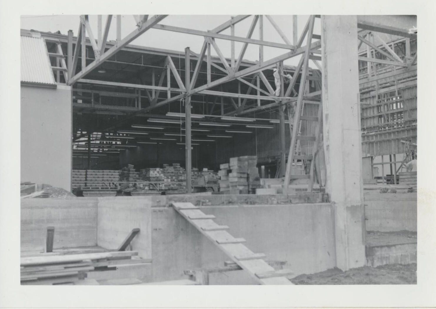 Print, photographic. 5 x 3 1/2 b&w. Construction of can line and warehouse on east side of main brewery and Carlyon Bridge. Warehouse addition. October 5, 1956.