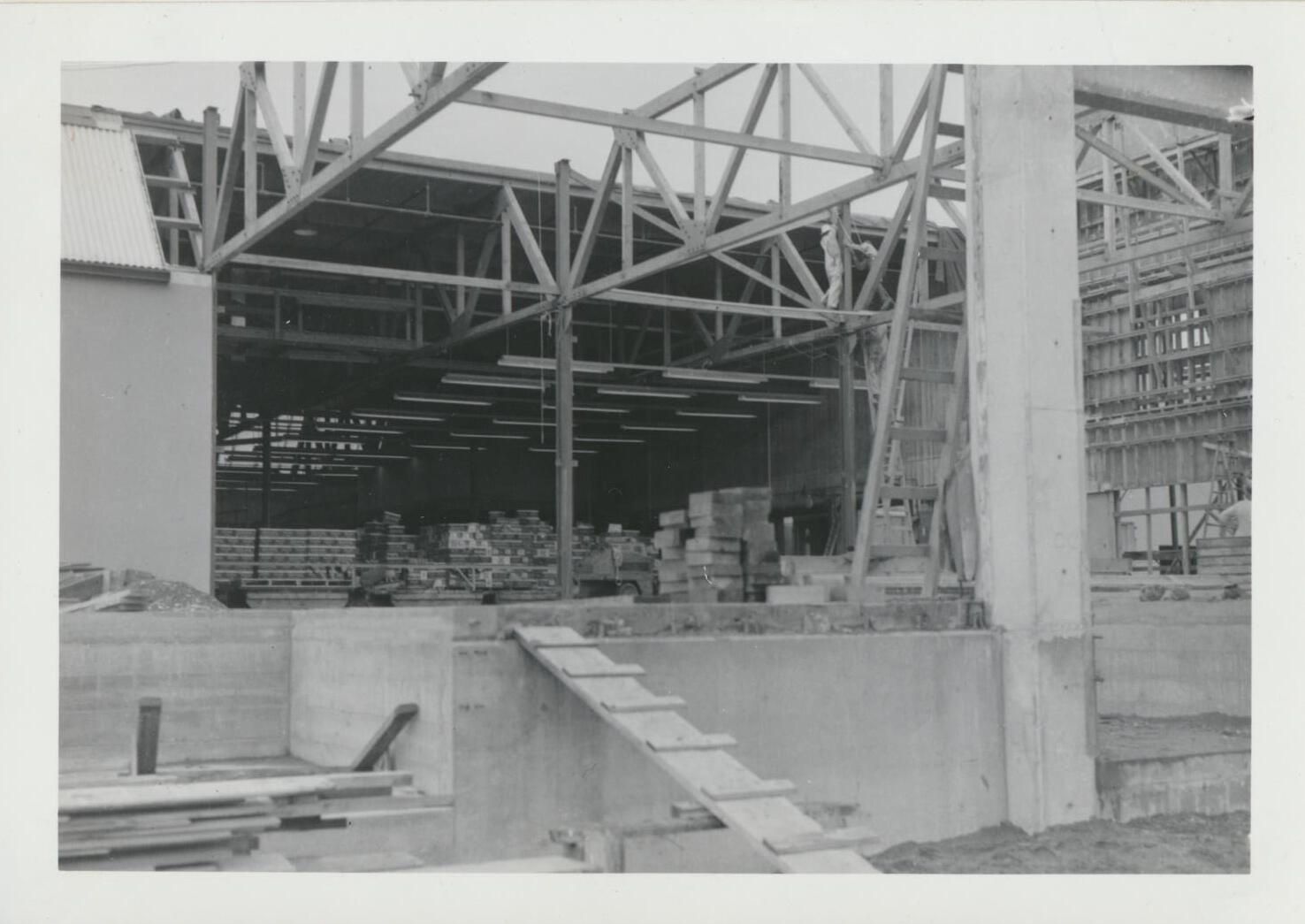 Print, photographic. 5 x 3 1/2 b&w. Construction of can line and warehouse on east side of main brewery and Carlyon Bridge. Warehouse addition. October 5, 1956.