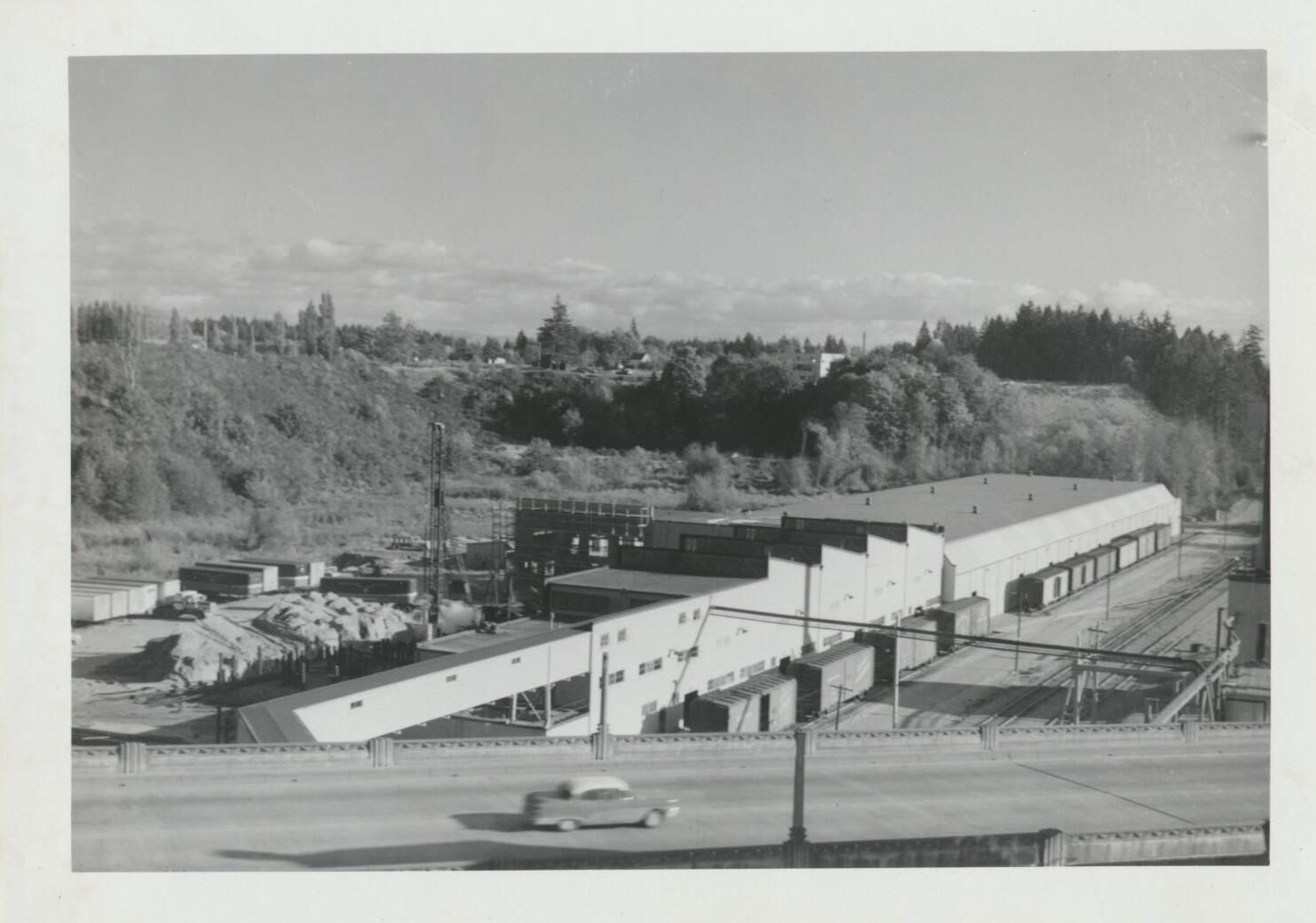 Print, photographic. 5 x 3 1/2 b&w. Construction of can line and warehouse on east side of main brewery and Carlyon Bridge. Overview of warehouse addition. October 12, 1956.