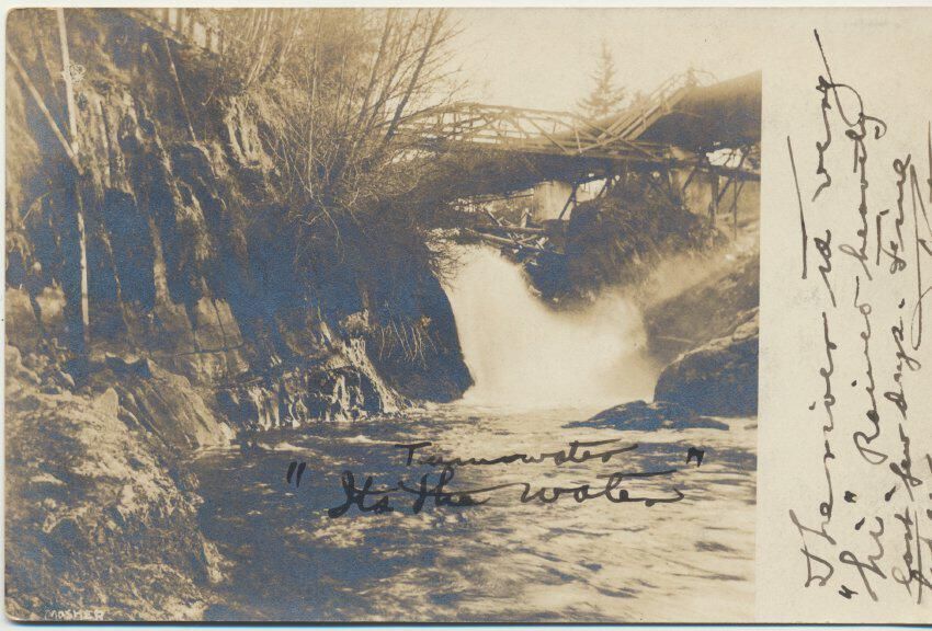 Postcard, picture. 5 1/2 x 3 1/2 real photo postcard. Shows lower falls of the Deschutes River. Postcard has message on front (Tumwater It's the Water. The river is very "hi". Rained heavily last few days. Fine today. Peter.). Back is addressed to Mr. Frederick W. Schmidt c/o Hotel Belvedere, New York City. Otherwise, postally unused (no stamp or postmark).Name/Title