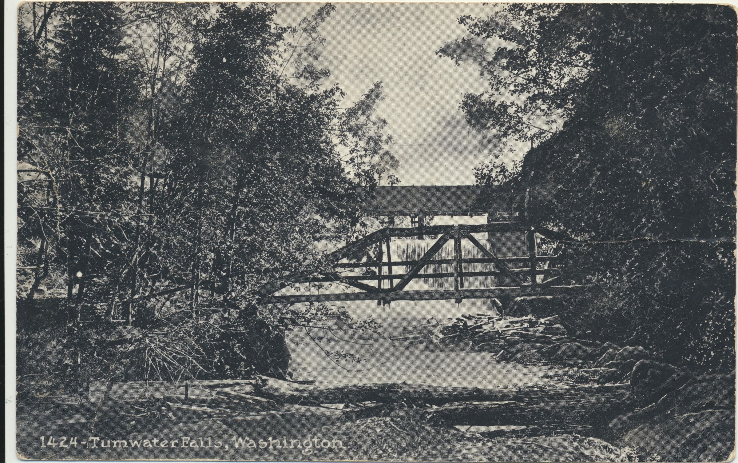 Postcard, picture. 5 1/2 x 3 1/2 real photo postcard. Shows lower Tumwater Falls on Deschutes River. Postally used, postmarked July 3, 1920. Sent to Mrs. E. Perring (Olympia) from her son Norman.