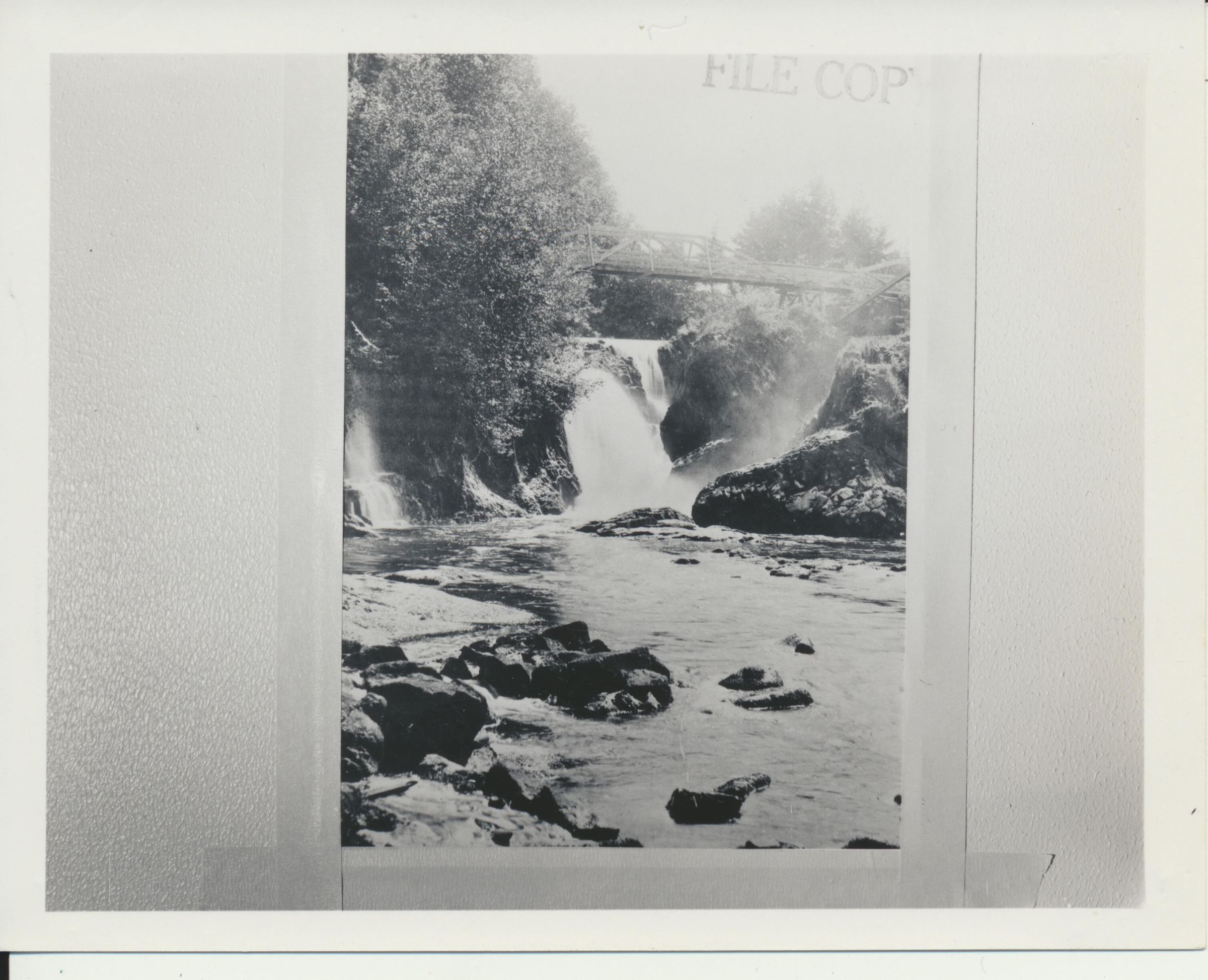 Print, photographic (and 2 negatives). 5 x 4 b&w. View of the lower falls and bridge on the Deschutes River.