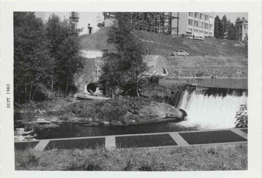 Print, photographic. 5 x 3 1/2 b&w. View of the fish ladder and upper falls of the Deschutes River, with brewery in the background.
