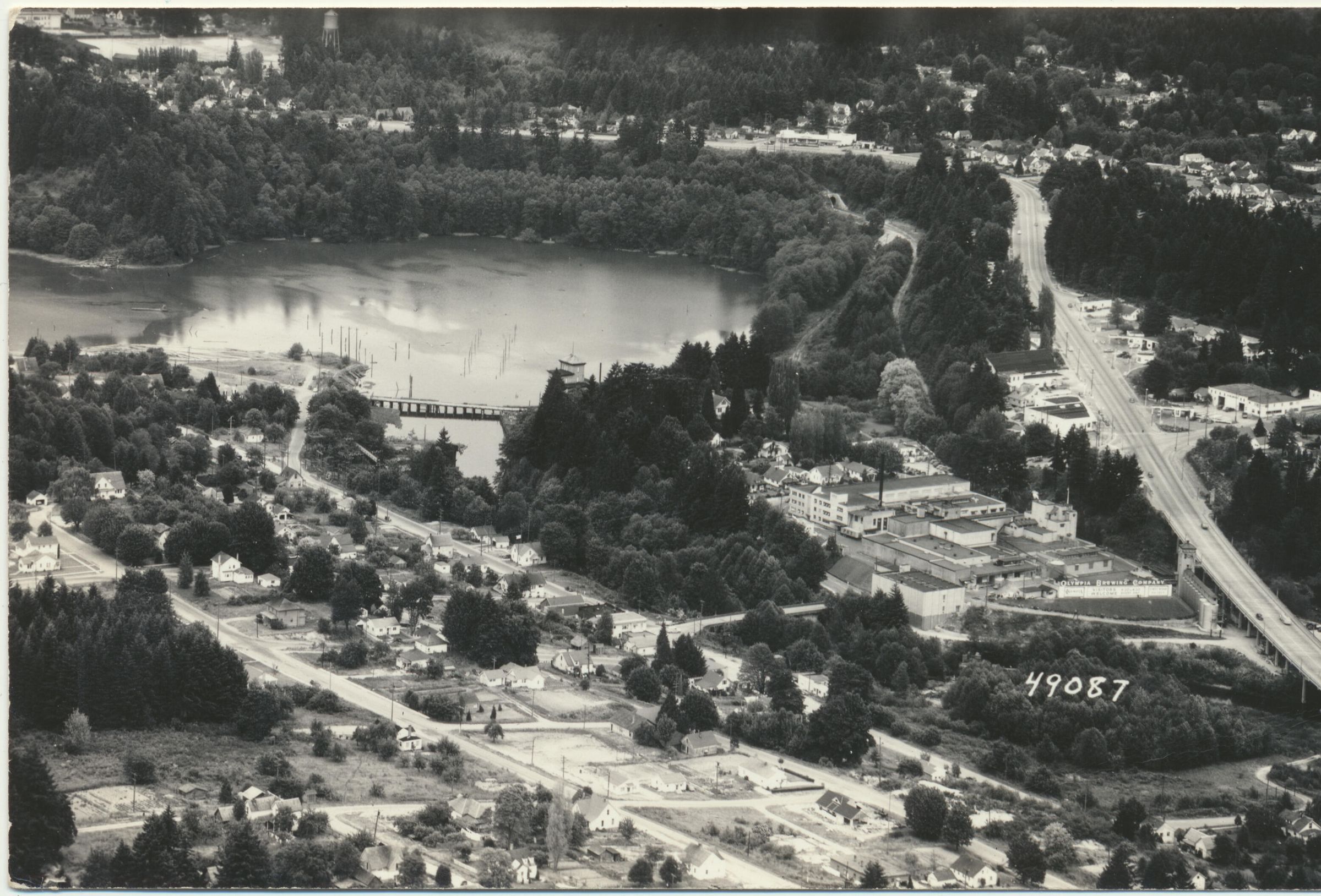 Print, photographic. 5 1/2 x 3 1/2 b&w. Aerial view of post-Prohibition Olympia Brewing Company plant, looking northeast. Good view of Tumwater before freeway.