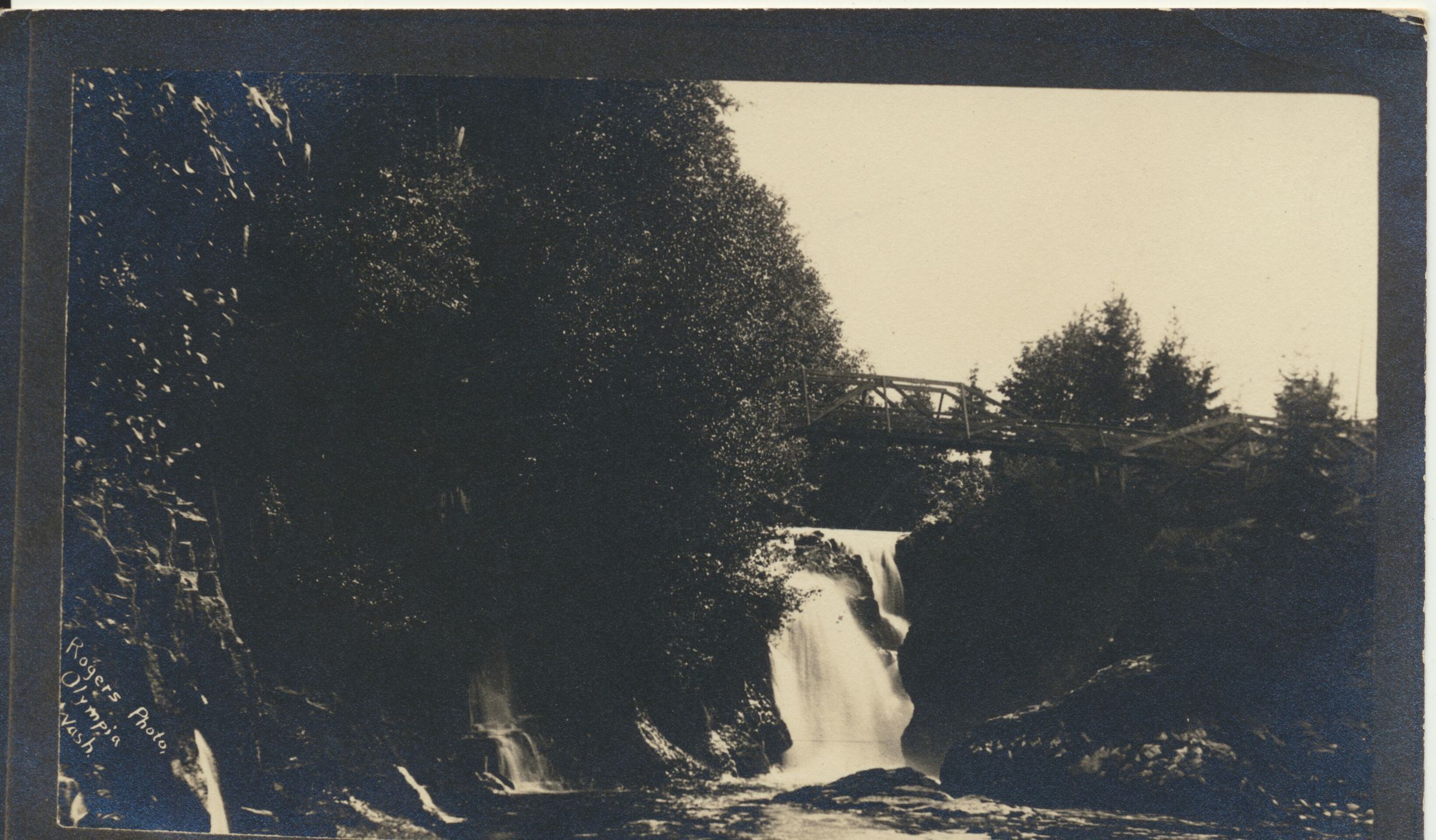 Print, photographic (2). 5 1/2 x 3 1/4 b&w. View of lower falls of the Deschutes River, with bridge in background. Rogers Studio, Olympia.