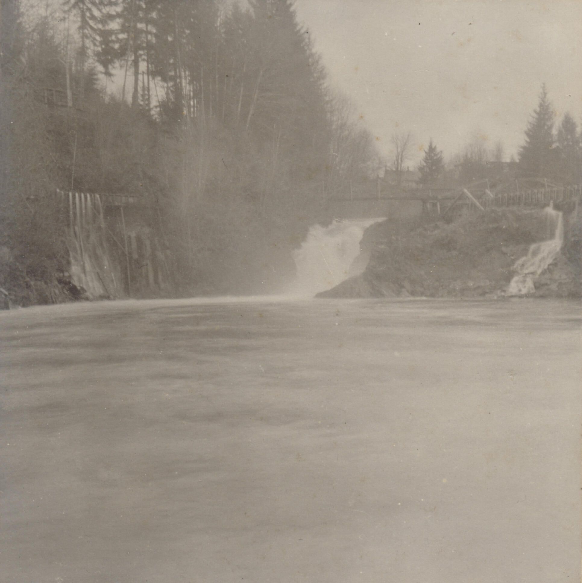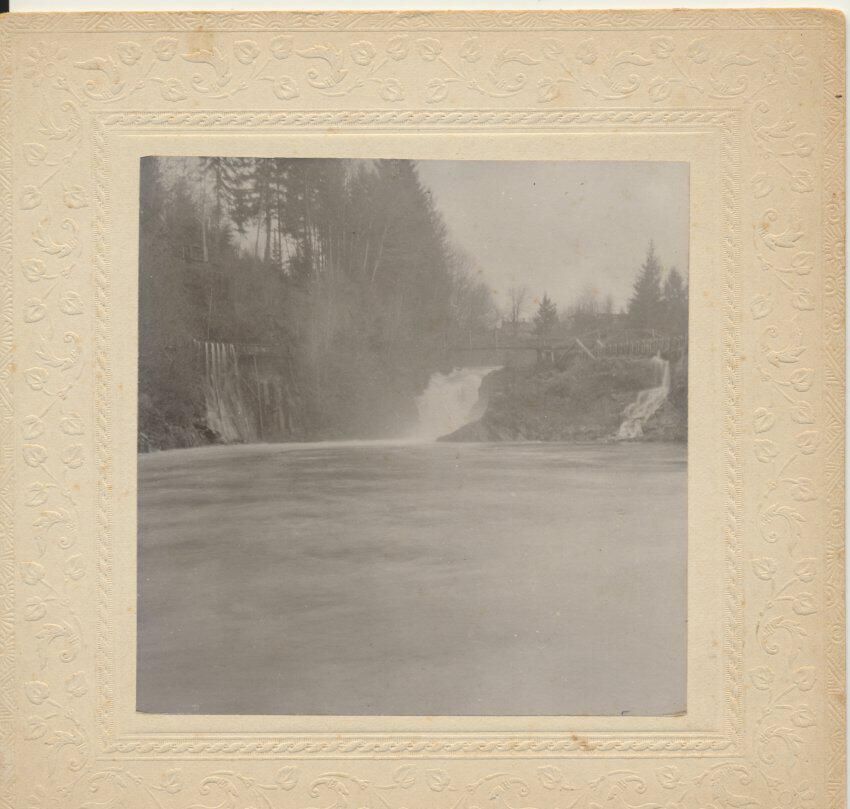 Print, photographic. 3 1/4 x 3 1/4 b&w on 5 x 5 white board. Lower falls of the Deschutes River.