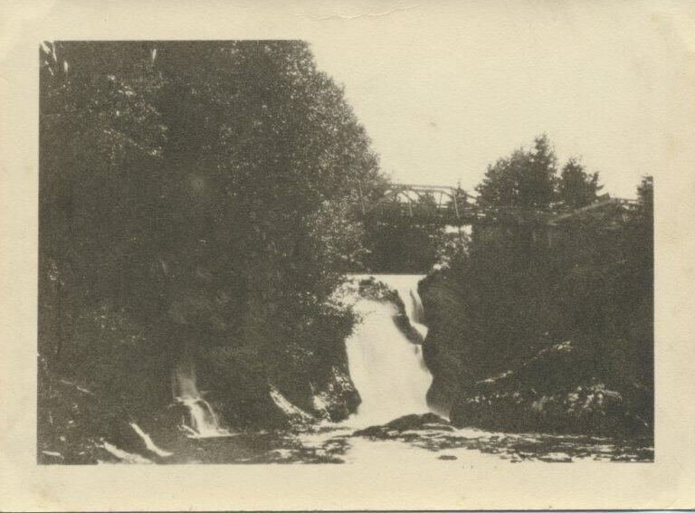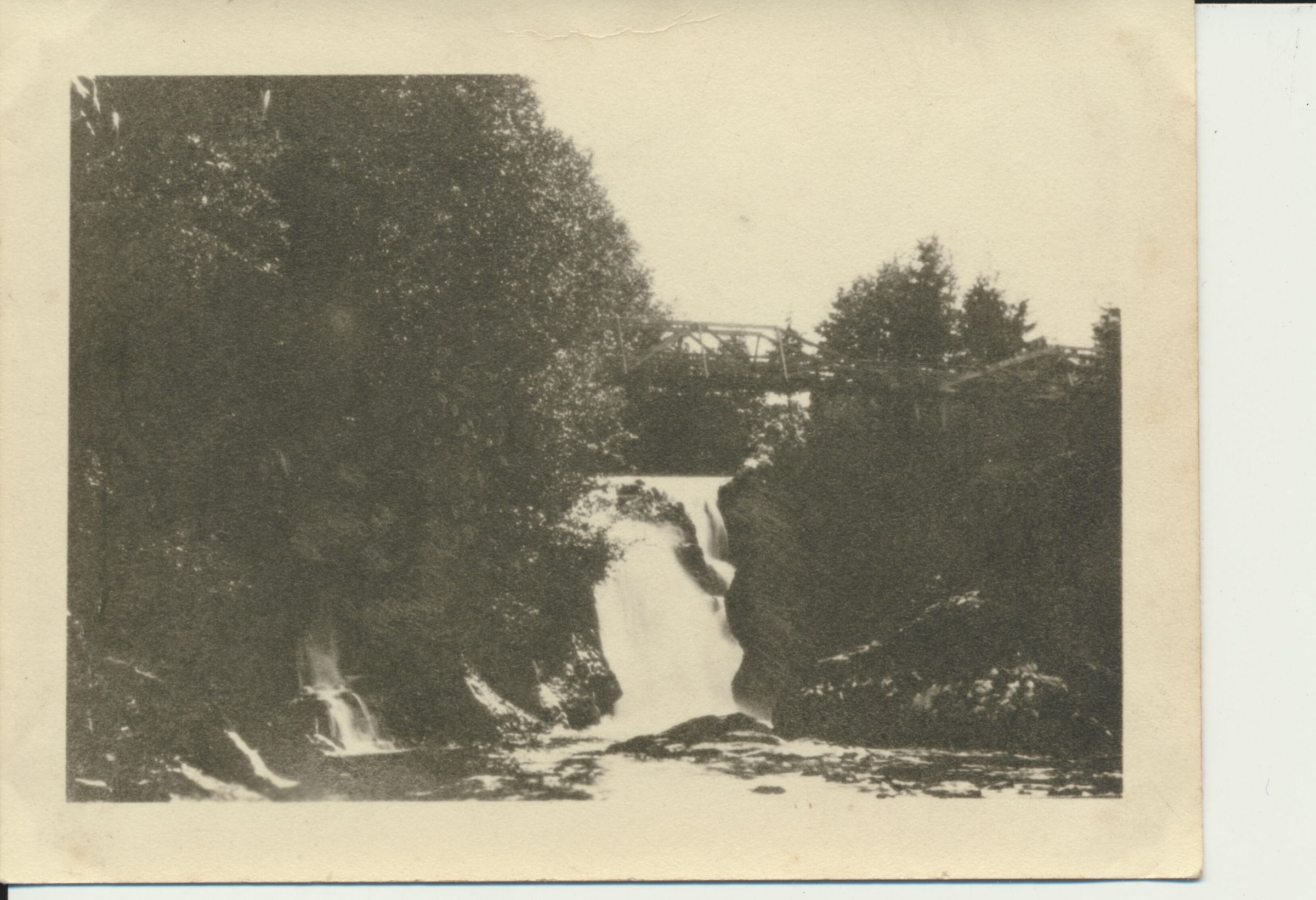 Print, photographic. 5 x 3 1/2 b&w. View of lower falls of the Deschutes River; bridge in background.