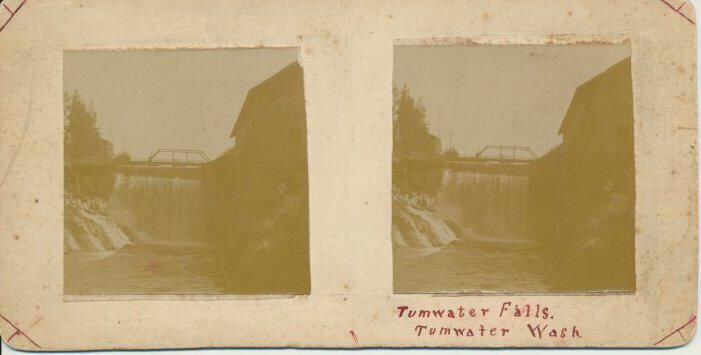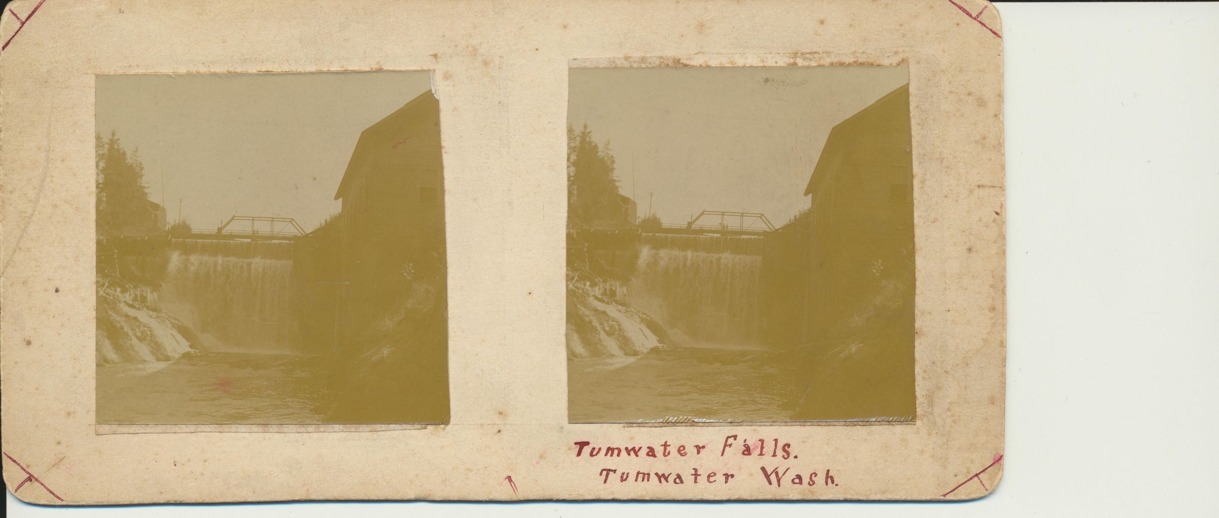 Stereograph. 2 1/2 x 2 1/2 sepia images on 7 x 3 1/2 card. View of middle Tumwater Falls, with Gelbach mill on right and footbridge in background.