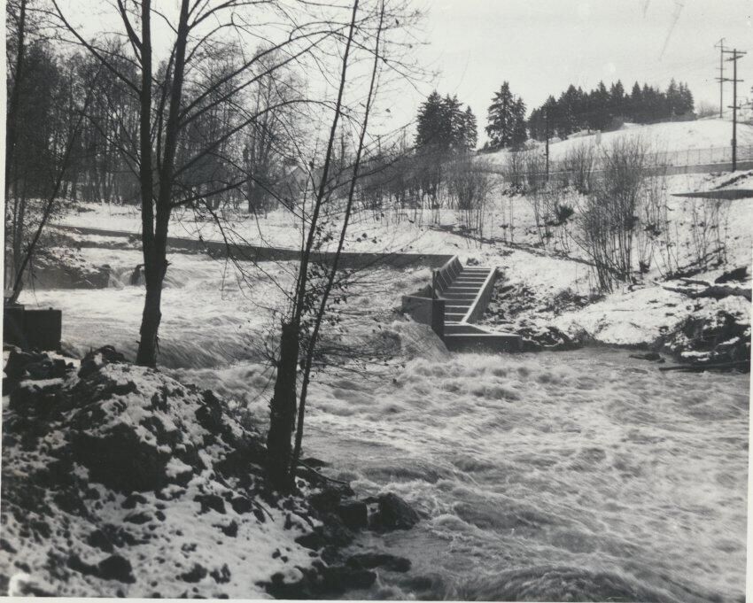 Print, photographic. 5 1/2 x 4 1/2 b&w. View of Deschutes River at flood stage, shows fish ladders near upper falls.