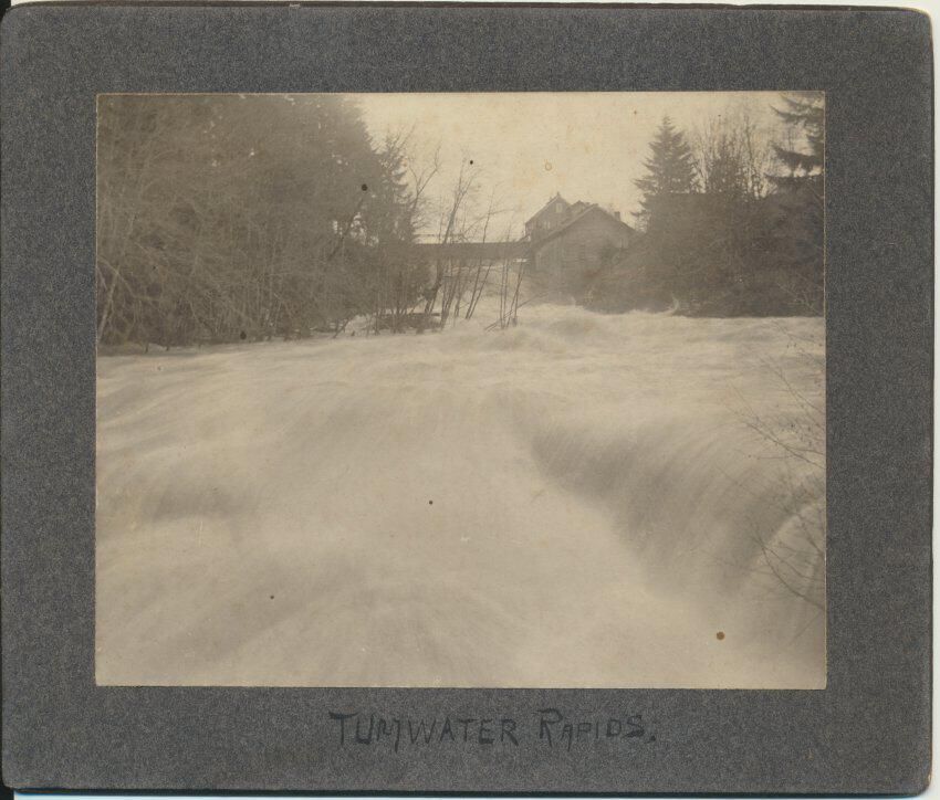 Print, photographic. 4 1/2 x 3 3/4 b&w, on 6 x 5 board. View of Deschutes River at flood stage, shows middle falls, with mill buildings in background. Photo by Sternberg & Mosher, Olympia.