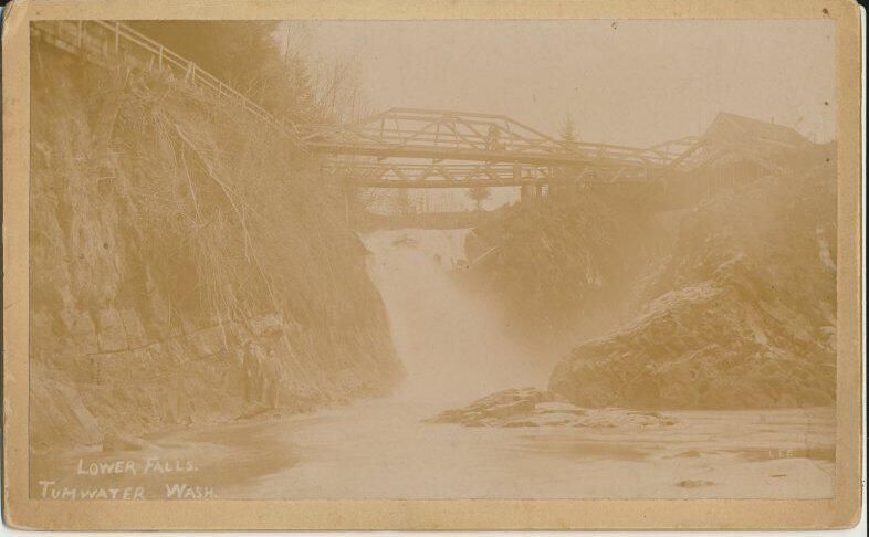 Print, photographic. 7 1/2 x 4 1/2 sepia image on 8 x 5 board. Lower falls of the Deschutes River, with 2 walking bridges above falls. 2 men standing at base of falls. Photo by L. E. Freitag, Olympia.