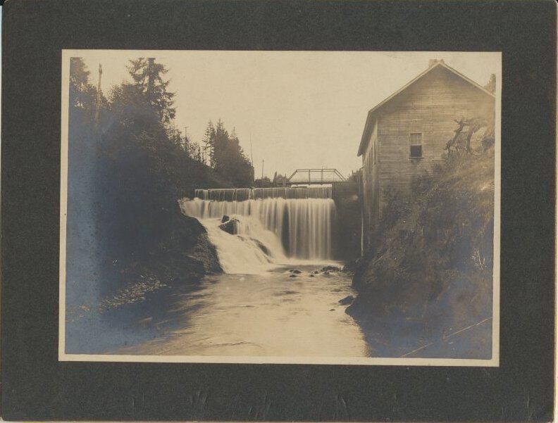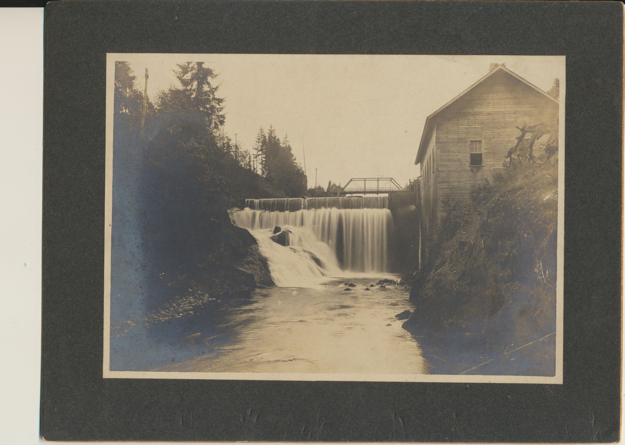 Print, photographic. 4 3/4 x 6 3/4 b&w image on 6 1/2 x 8 1/2 board. First power plant, Olympia Light and Power, at middle falls.