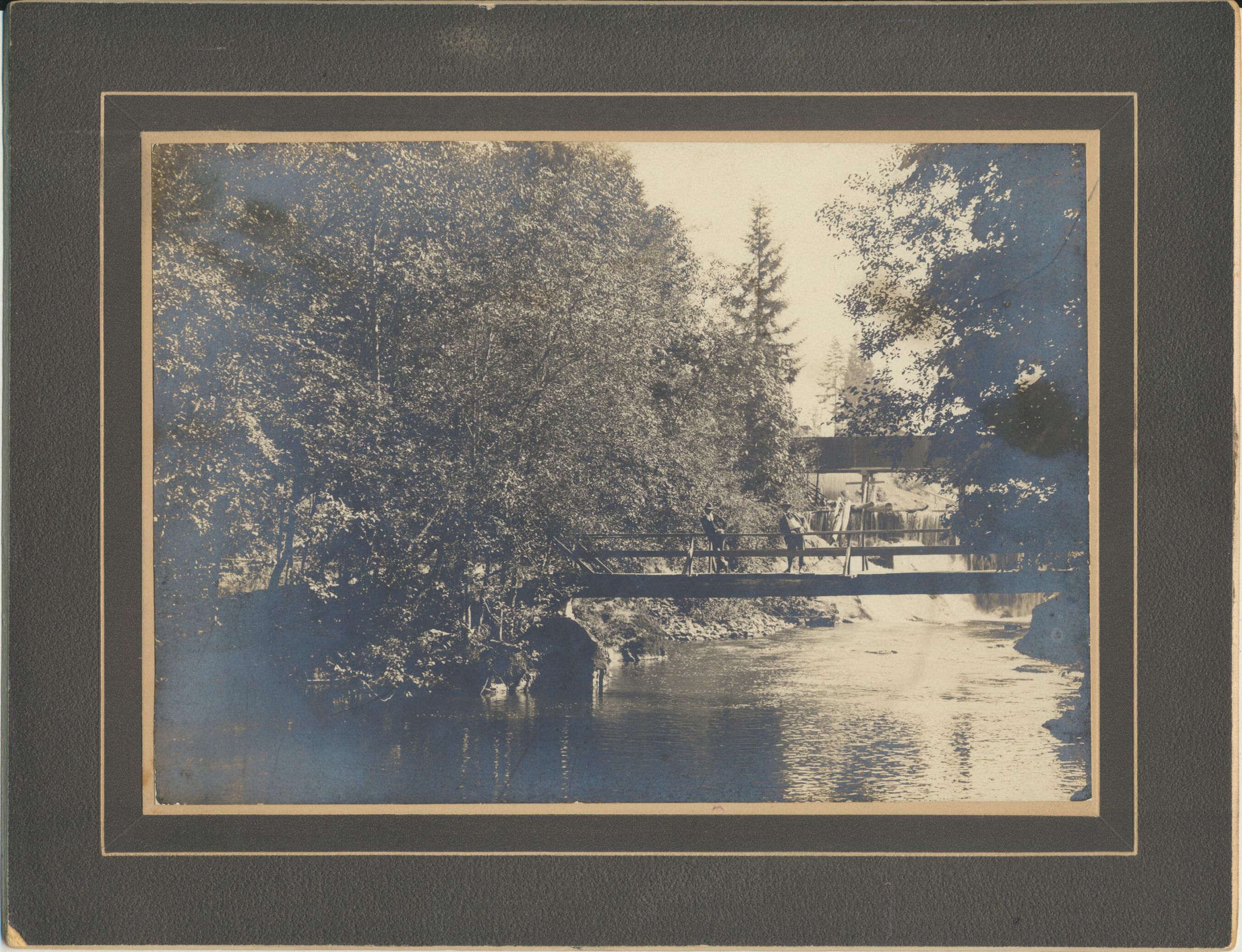 Print, photographic. 7 x 5 b&w image on 9 x 7 board. Two men on footbridge across Deschutes River, falls and water flume in background.