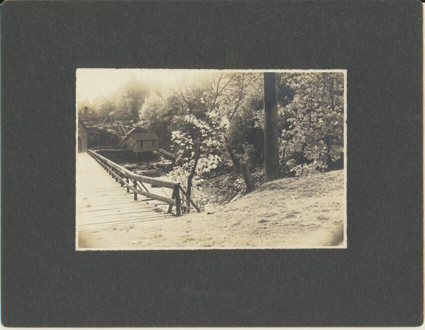 Print, photographic. 5 3/4 x 3 3/4 b&w image on 9 x 7 board. Bridge across Deschutes River, looking west. Buildings in background. Photo by Mosher, Olympia. "About Nov 15 -06" written on back.