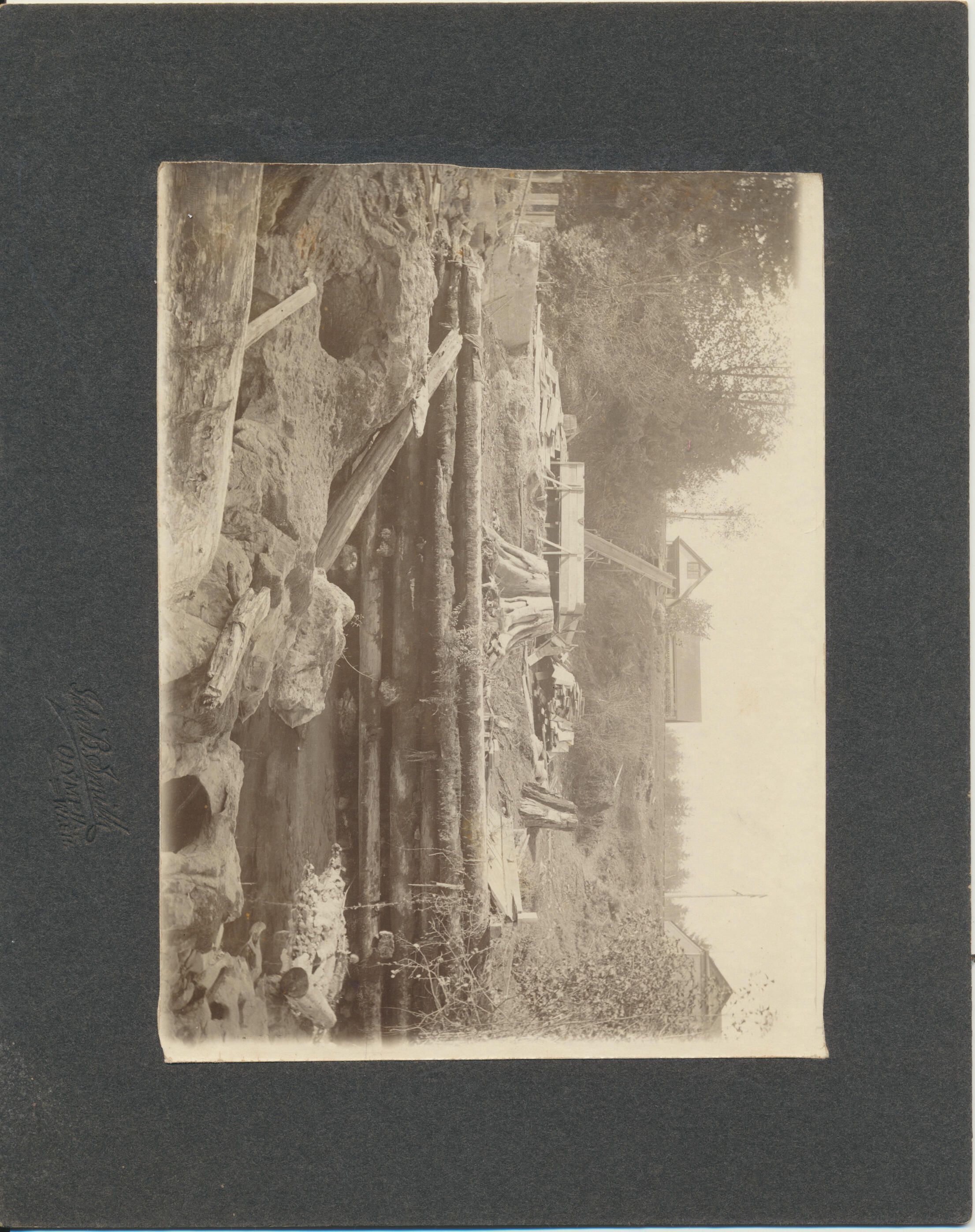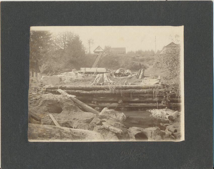 Print, photographic. 7 x 5 b&w image on 9 x 7 1/4 board. View of foundation work for gas producer, across river from Olympia Brewing Company below lower falls on Deschutes River. Shows rooflines of a few houses above river. Photo by Ida B. Smith, Olympia.Name/Title