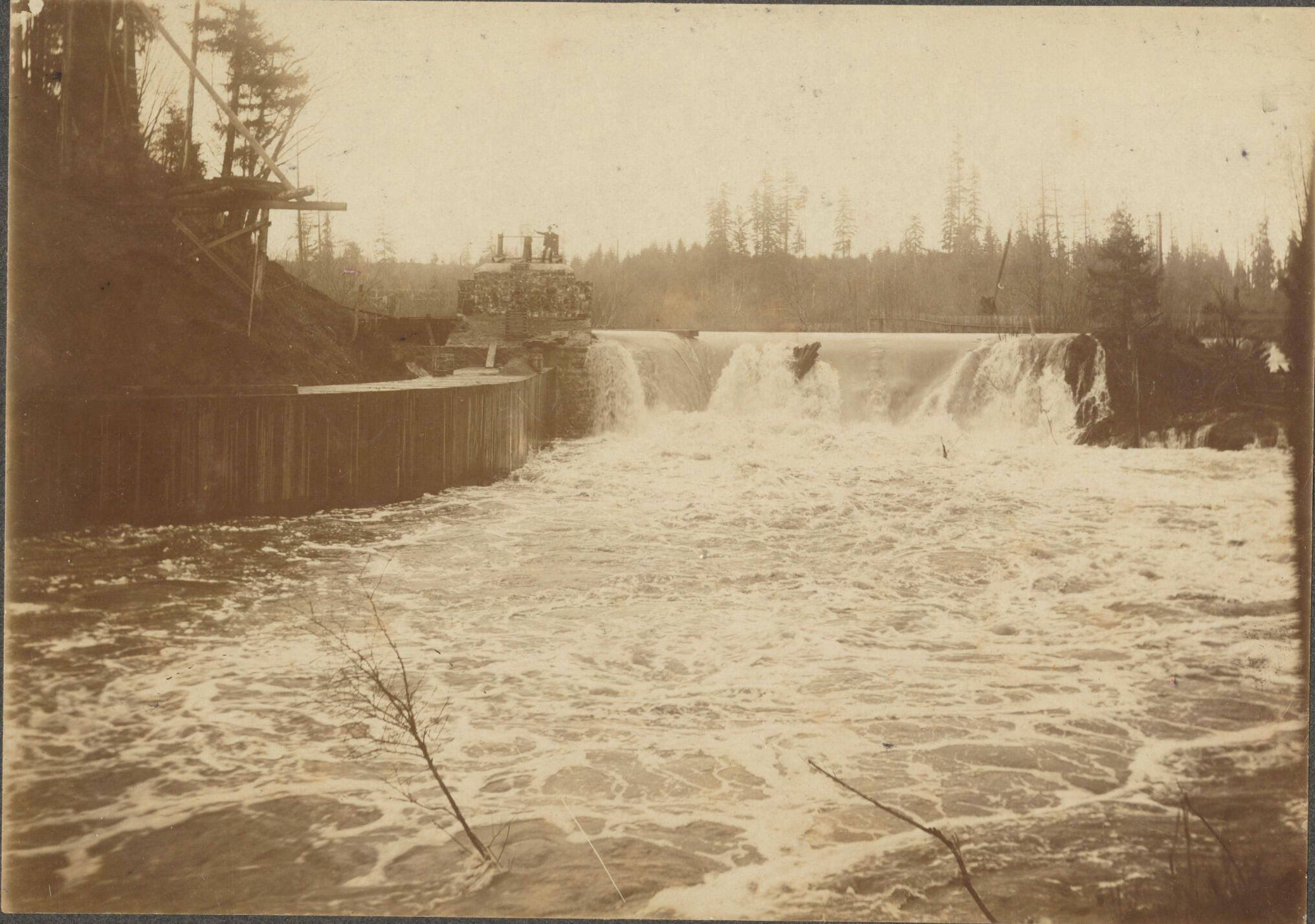 Print, photographic. 6 3/4 x 4 3/4 sepia image on 10 3/4 x 8 3/4 board. View of upper falls on Deschutes River. Shows flume along east bank. Man standing atop highest point of dam abutment.