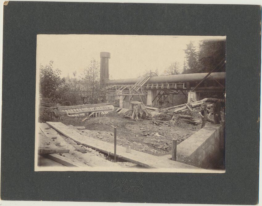 Print, photographic. 7 x 5 b&w image on 9 1/2 x 7 1/2 board. View of construction above lower falls. Shows flume and standpipe for powerhouse. Concrete footing in front (west bank). Two workmen at right. Photo by Frank Kenney, November 2, 1905.Name/Title