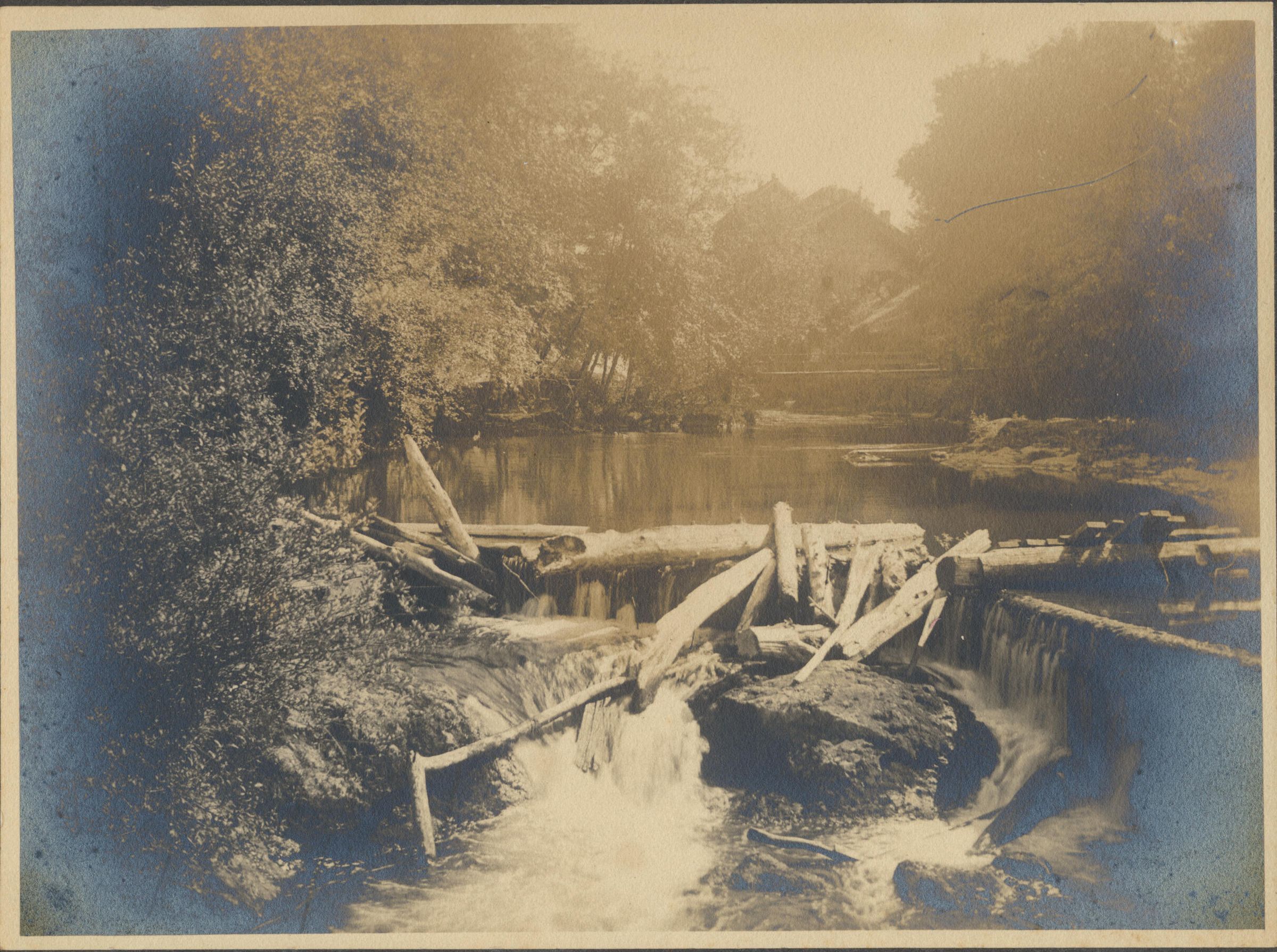 Print, photographic.8 x 6 sepia image on 10 3/4 x 9 board. Shows middle falls of Deschutes River, with mill buildings in background. Back inscribed "Peter G. Schmidt Tumwater, Wash."