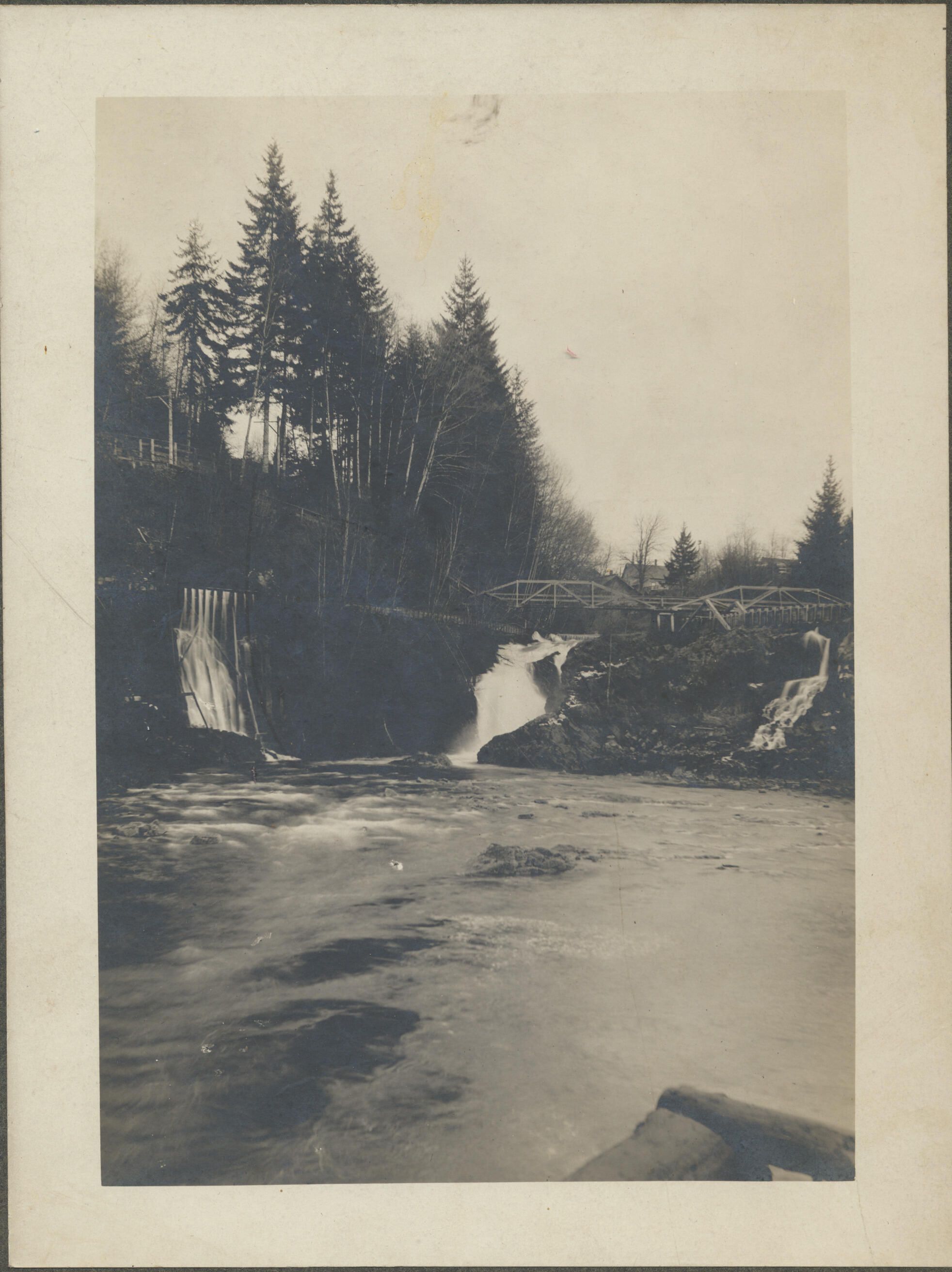 Print, photographic. 6 1/2 x 8 1/2 b&w image on 9 x 10 3/4 board. Shows lower falls of Deschutes River, with bridge over river, and buildings in background. Back inscribed "Tumwater Falls, Tumwater near Olympia Wash. Near plant of Olympia Brg. Co."Name/Title