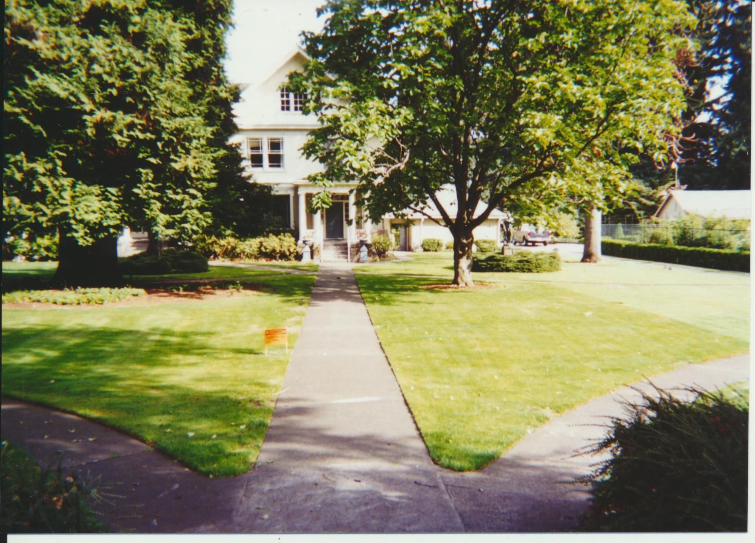Photograph. 4 3/ 4 x 3 1/2 color. Schmidt House restoration done in September 2001. Photo by Vida Zvirzdys-Farler. View of house from front gate.