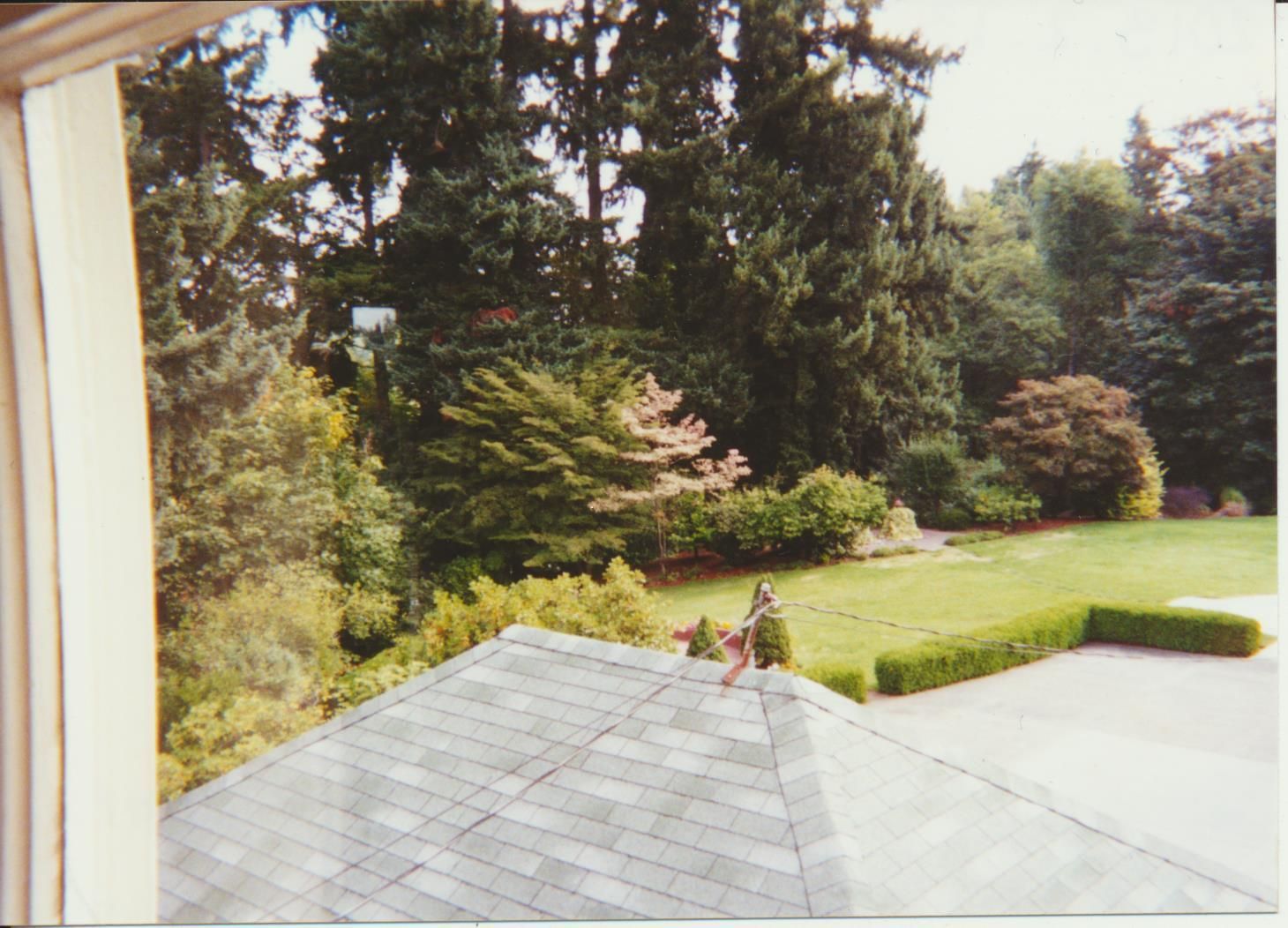 Photograph. 4 3/ 4 x 3 1/2 color. Schmidt House restoration done in September 2001. Photo by Vida Zvirzdys-Farler. View of northeast yard and roof of garage, from 2nd story window.
