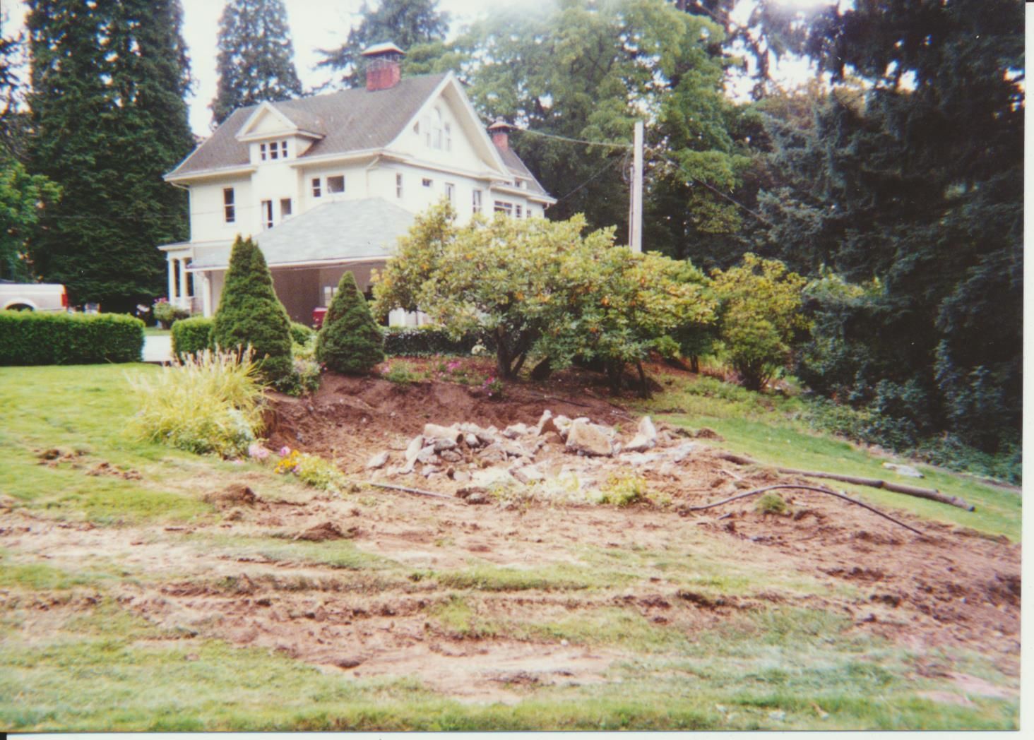 Photograph. 4 3/ 4 x 3 1/2 color. Schmidt House restoration done in September 2001. Photo by Vida Zvirzdys-Farler. View of removal of red patio.