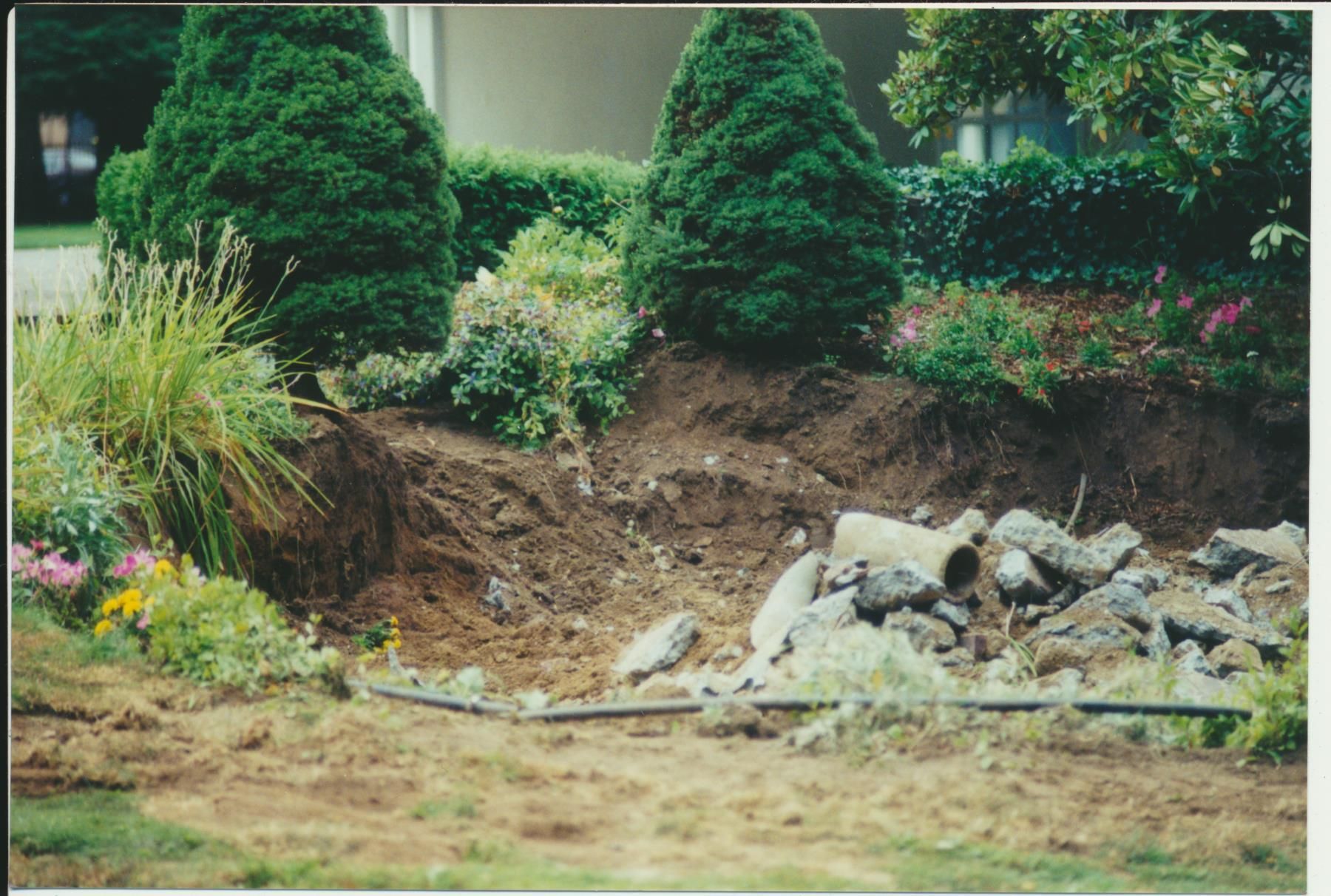 Photograph. 4 3/ 4 x 3 1/2 color. Schmidt House restoration done in September 2001. Photo by Vida Zvirzdys-Farler. View of removal of red patio.