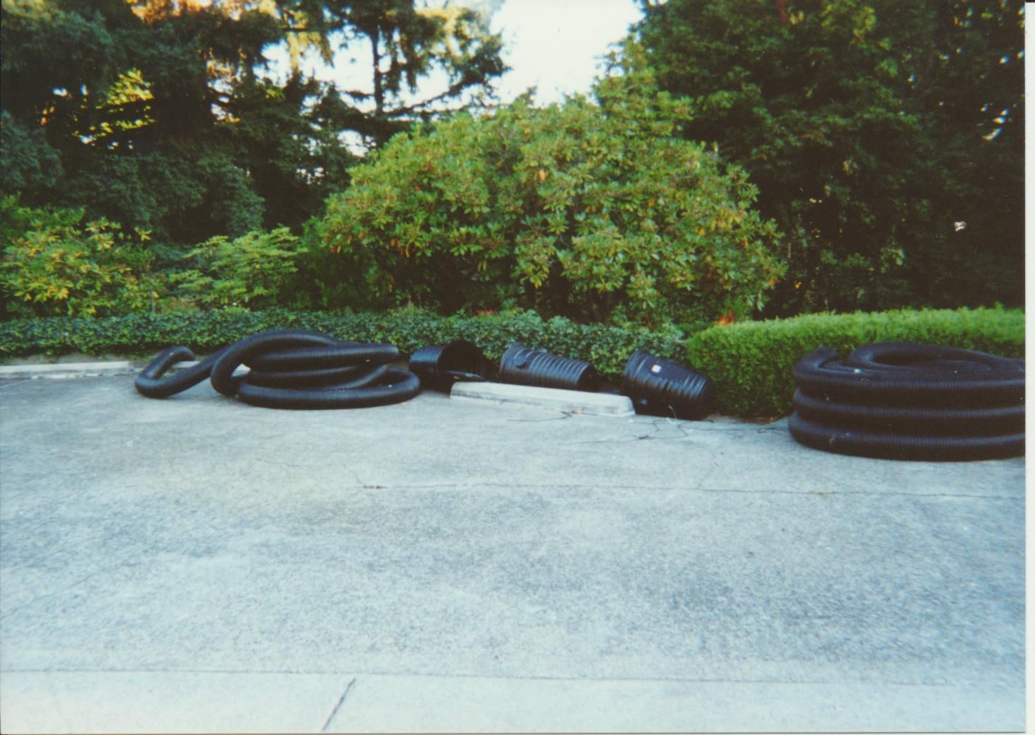 Photograph. 4 3/ 4 x 3 1/2 color. Schmidt House restoration done in September 2001. Photo by Vida Zvirzdys-Farler. View of drainage pipe on edge of carport.
