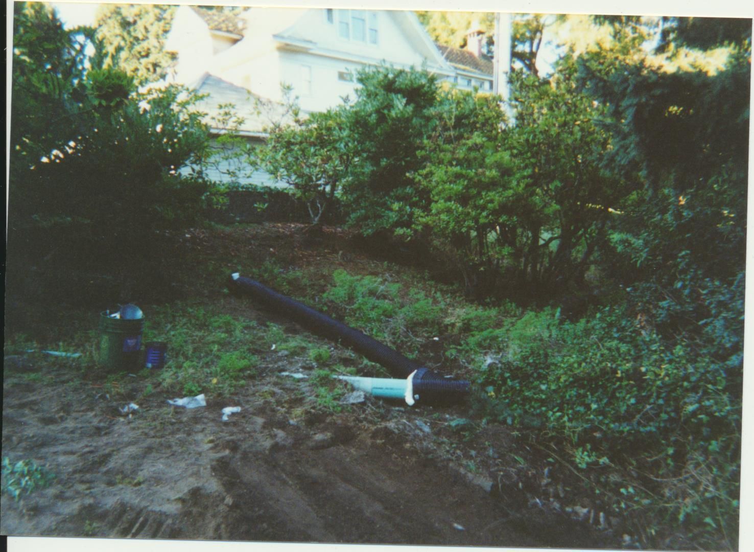 Photograph. 4 3/ 4 x 3 1/2 color. Schmidt House restoration done in September 2001. Photo by Vida Zvirzdys-Farler. Drain pipe being installed on north yard.