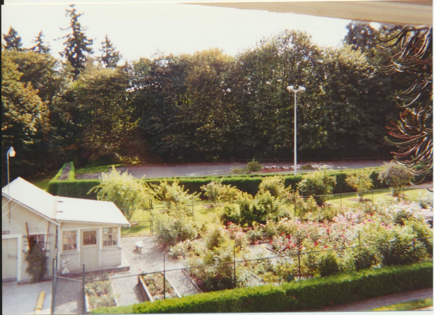 Photograph. 4 3/ 4 x 3 1/2 color. Schmidt House restoration done in September 2001. Photo by Vida Zvirzdys-Farler. View of storage shed and rose garden.