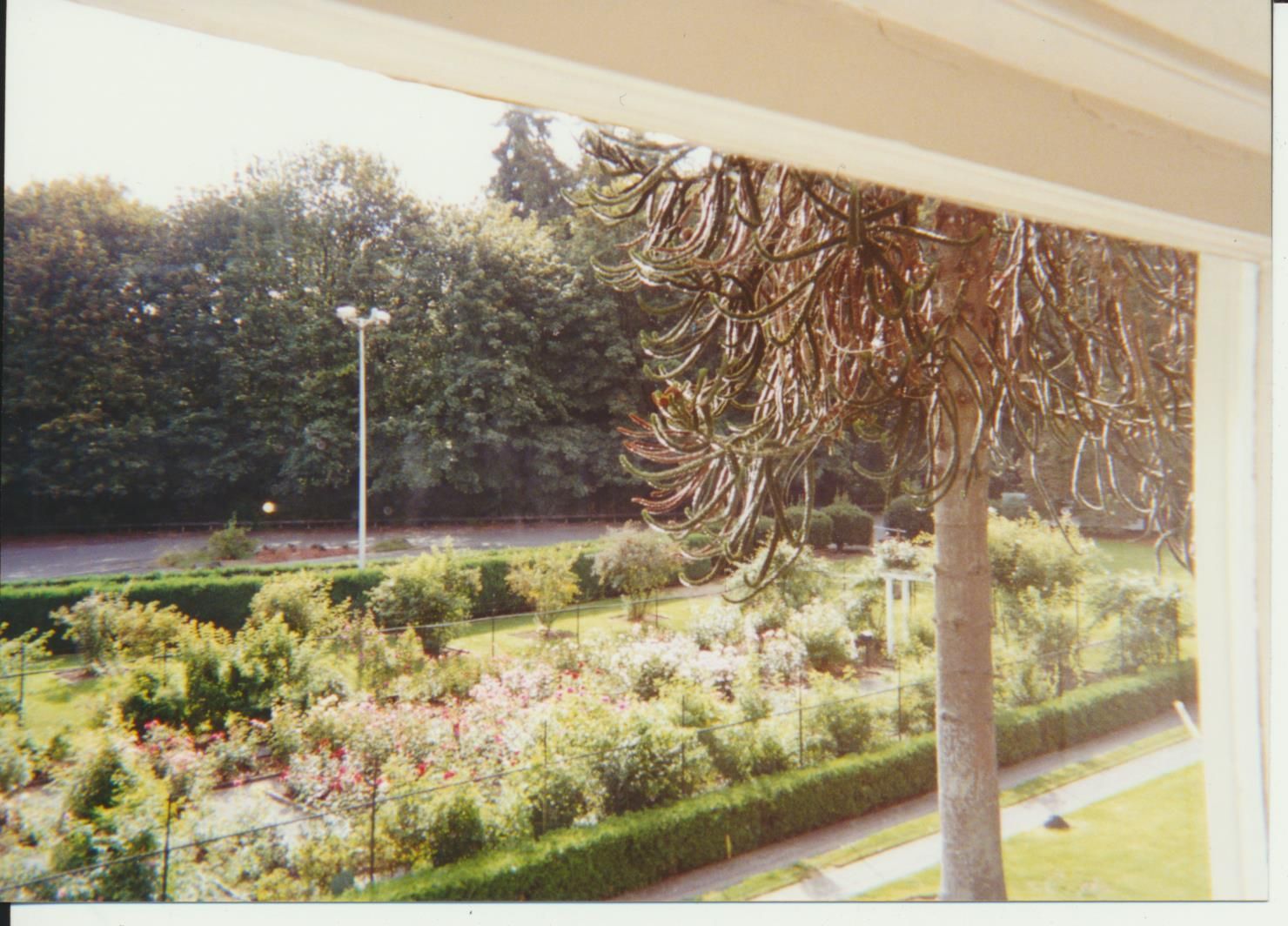 Photograph. 4 3/ 4 x 3 1/2 color. Schmidt House restoration done in September 2001. Photo by Vida Zvirzdys-Farler. View of rose garden and monkey puzzle tree.