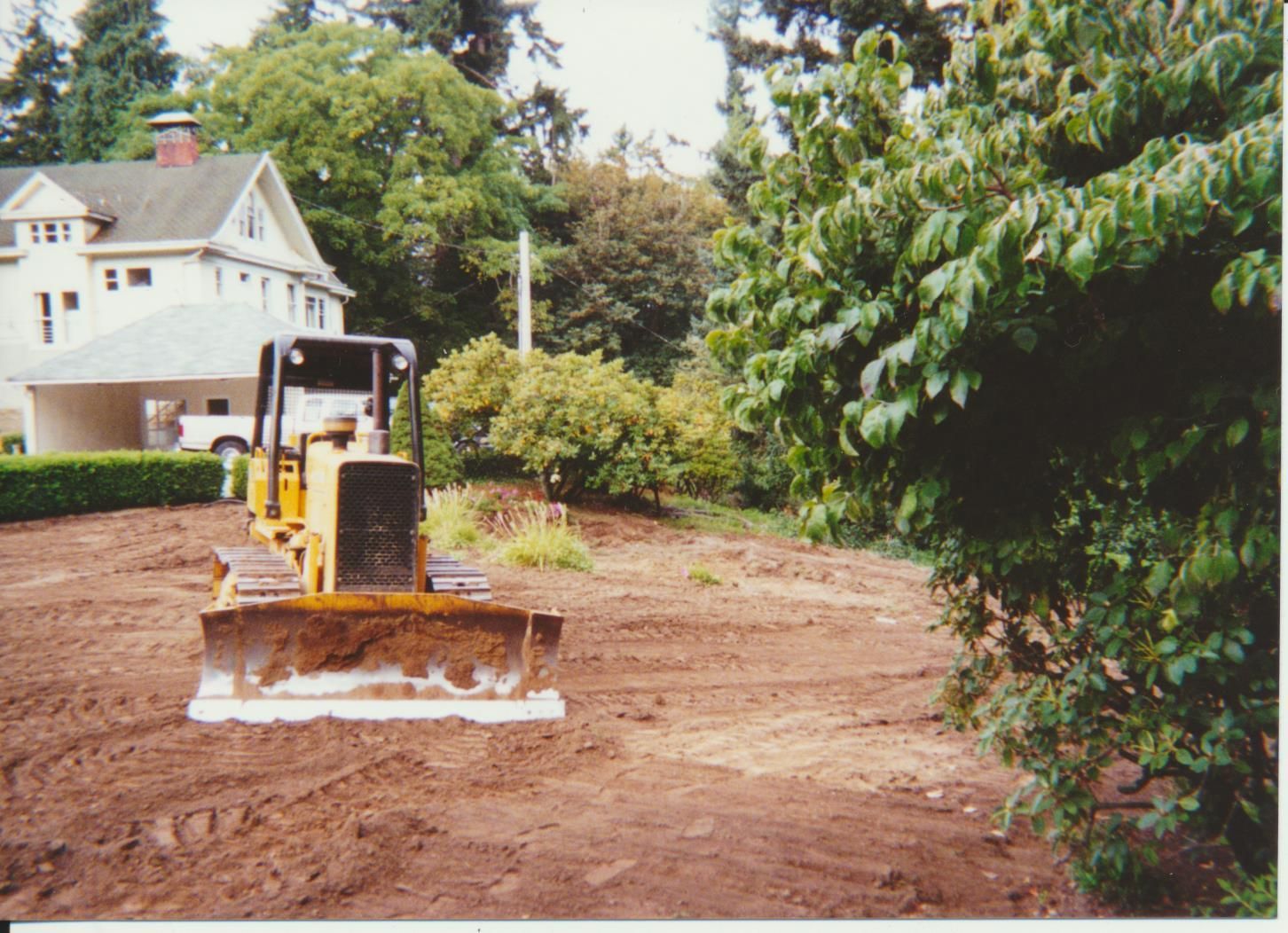 Photograph. 4 3/ 4 x 3 1/2 color. Schmidt House restoration done in September 2001. Photo by Vida Zvirzdys-Farler. Bulldozer moving dirt in northeast yard.