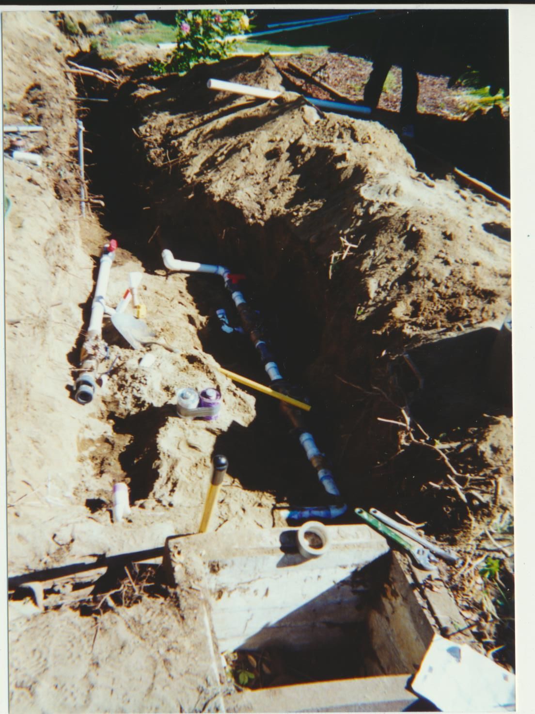 Photograph. 4 3/ 4 x 3 1/2 color. Schmidt House restoration done in September 2001. Photo by Vida Zvirzdys-Farler. Irrigation work around storage shed.