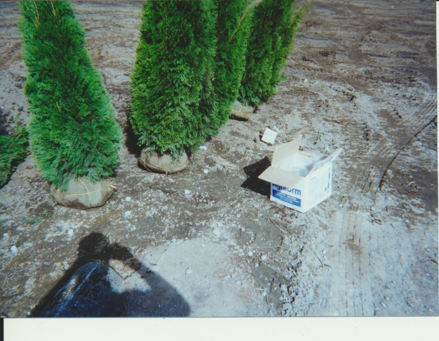 Photograph. 4 3/ 4 x 3 1/2 color. Schmidt House restoration done in October 2001. Photo by Vida Zvirzdys-Farler. Planting new arborvitae hedge.